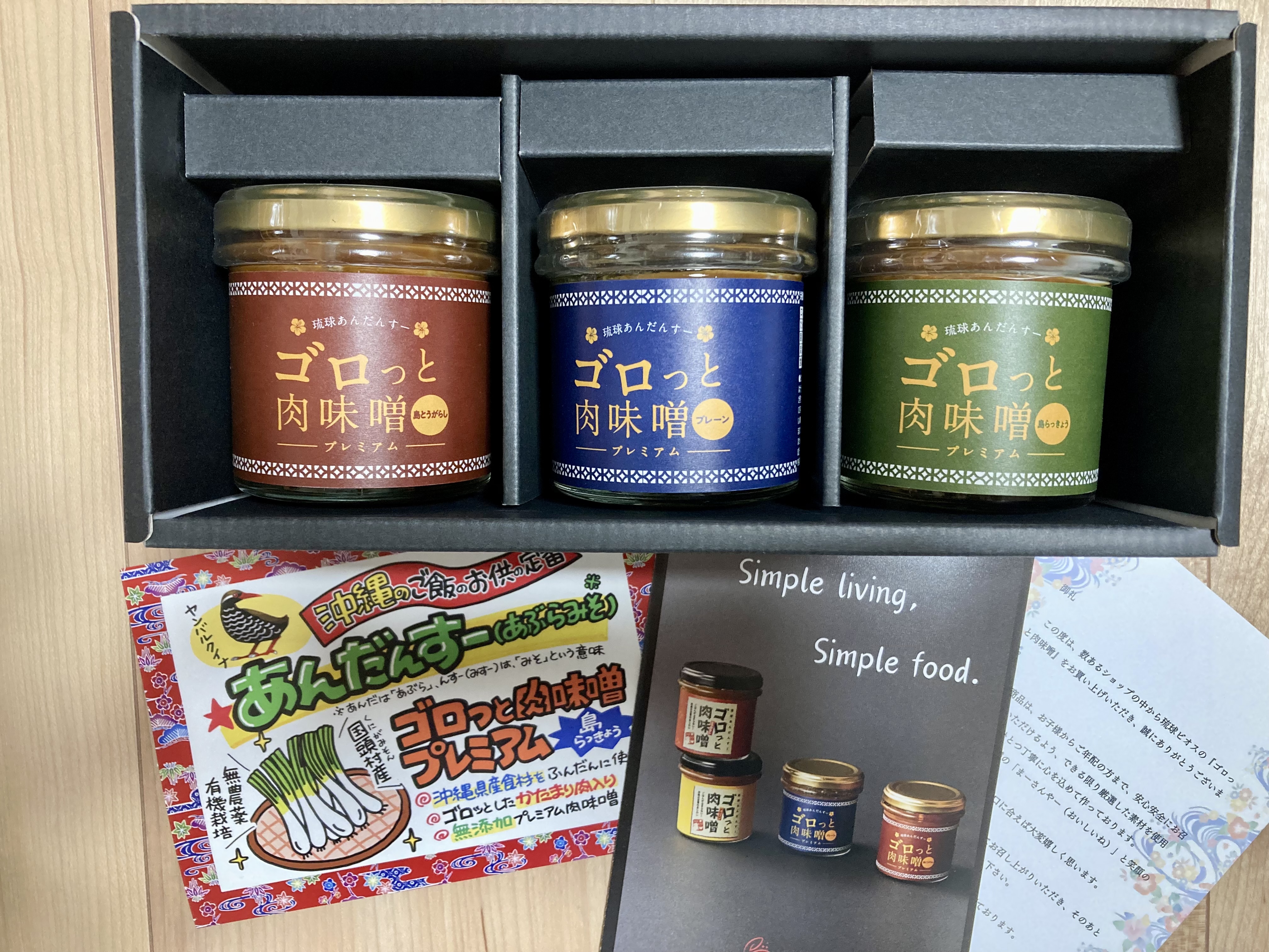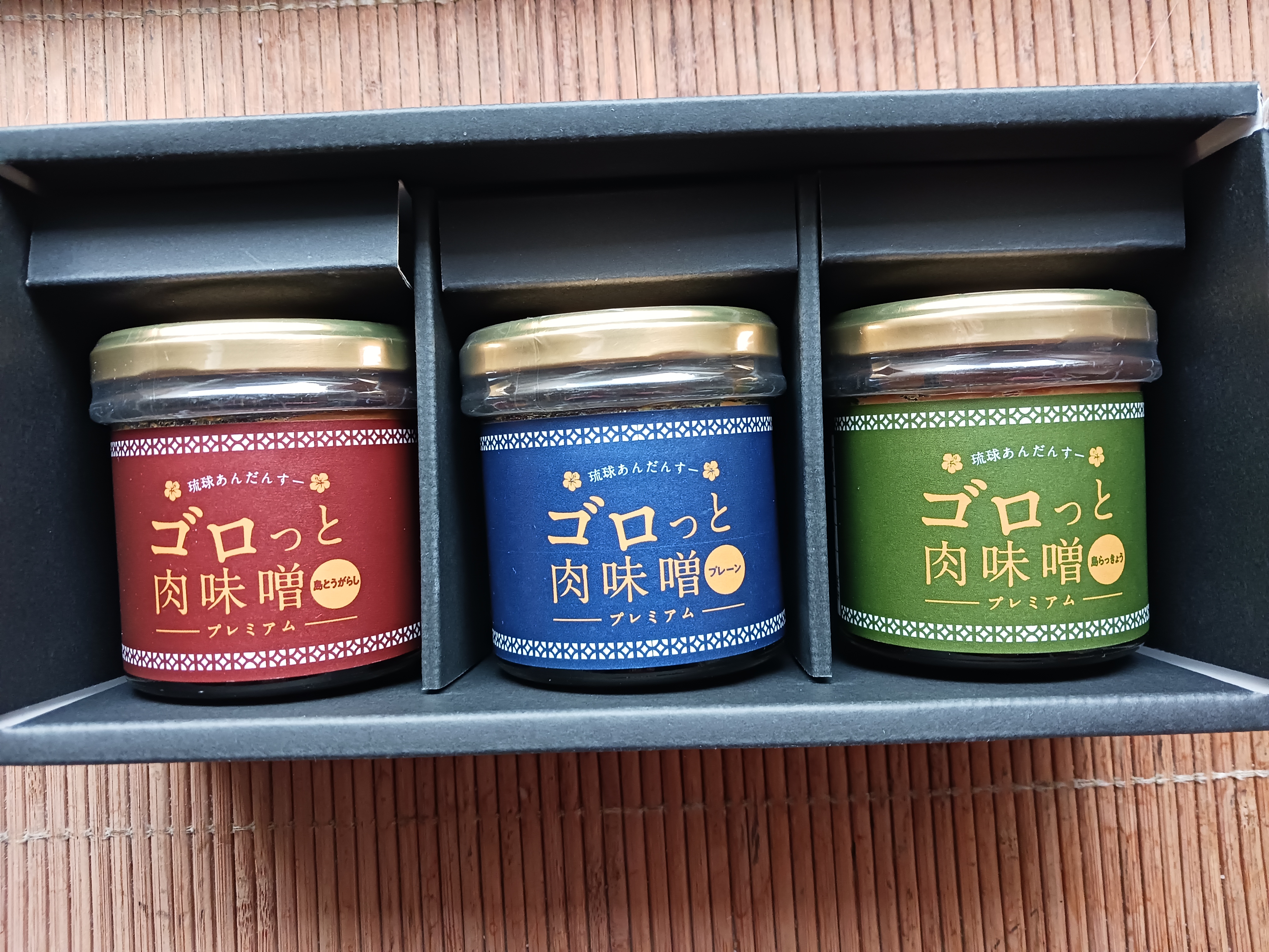 沖縄県産の豚肉、味噌、黒糖など沖縄素材にこだわった「肉味噌」です。ゴロっとした肉が入っているので食べ応え抜群です。沖縄県産豚肉、みそ、純黒糖をベースにしています。比較的甘口でベースの味をより感じられる「プレーン」、島唐辛子の種も含めて丸ごと使用しているので、後から来るピリッとした辛みと香りでごはんが進む「島とうがらし」、やんばる(国頭村)で栽培時農薬不使用の有機栽培された島らっきょうを使い、サッパリとした味わいに仕上げた「島らっきょう」の3種。異なる味わいのセットなので食べ比べが楽しめます。専用ボックスに入って届くので、贈り物におすすめです。