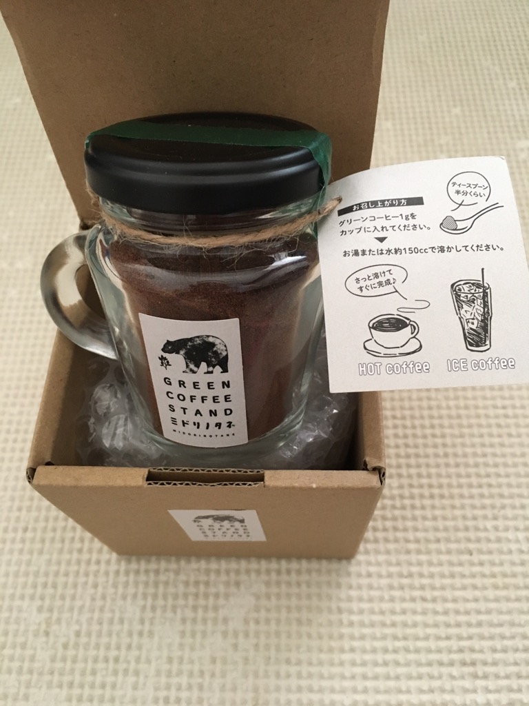 焙煎しないコーヒー生豆と、焙煎したコーヒーをブレンドして作る新しいジャンルの「グリーンコーヒー」です。「グリーンコーヒー」とは、焙煎する前の生豆のこと。焙煎すると損なわれてしまう栄養成分を取ることができ、焙煎コーヒーの香ばしさも楽しめるいいとこどりの商品。カフェインが少なくとても軽やかな味わいです。苦味酸味が少なく、ほんのり焼き芋の様な香りがする癒し系なので、ブラック苦手でも飲みやすい味わいです。パウダータイプなので、湯や水に溶かすだけで、淹れたての味が堪能できます。可愛らしい瓶入りで、プチギフトににもおすすめです。