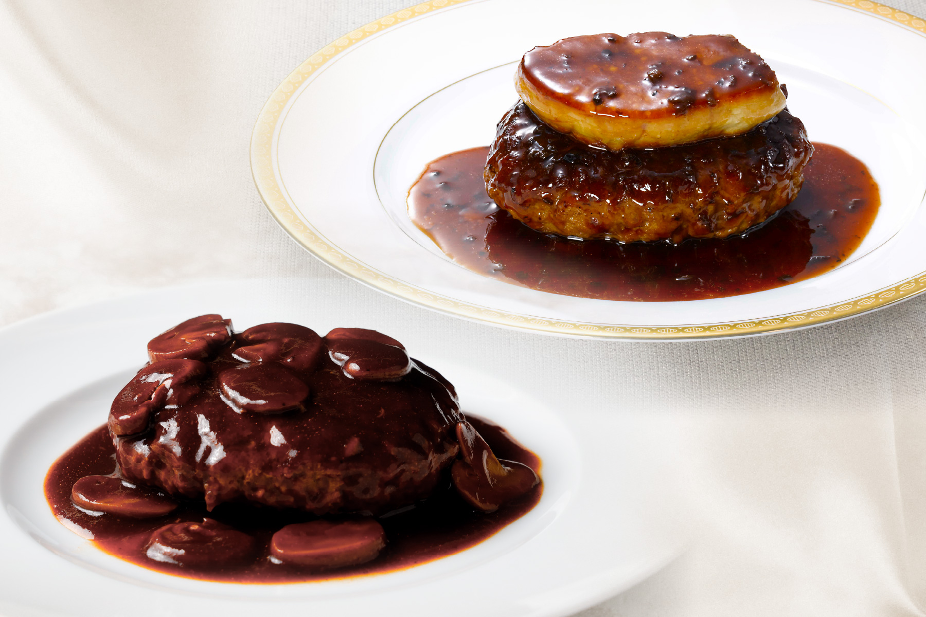 「ロッシーニ風ハンバーグ」とハンバーグの定番「デミグラスソースのハンバーグ」のセットです。切った瞬間に肉汁があふれ出すハンバーグには、国産黒毛和牛を使用し、牛肉の力強さを表現し、旨味を出すために豚肉を混ぜ込んでいます。フォアグラとトリュフを贅沢に組み合わせた「ロッシーニ風ハンバーグ」は、豊かな香りと共に、旨味が口いっぱいに広がります。「デミグラスソースのハンバーグ」の、デミグラスソースは、仔牛と香味野菜を丁寧に下処理し、オーブンでじっくり焼いた後、じっくり煮込んでいます。豪華な商品なので、ご褒美ディナーなどにもおすすめです。