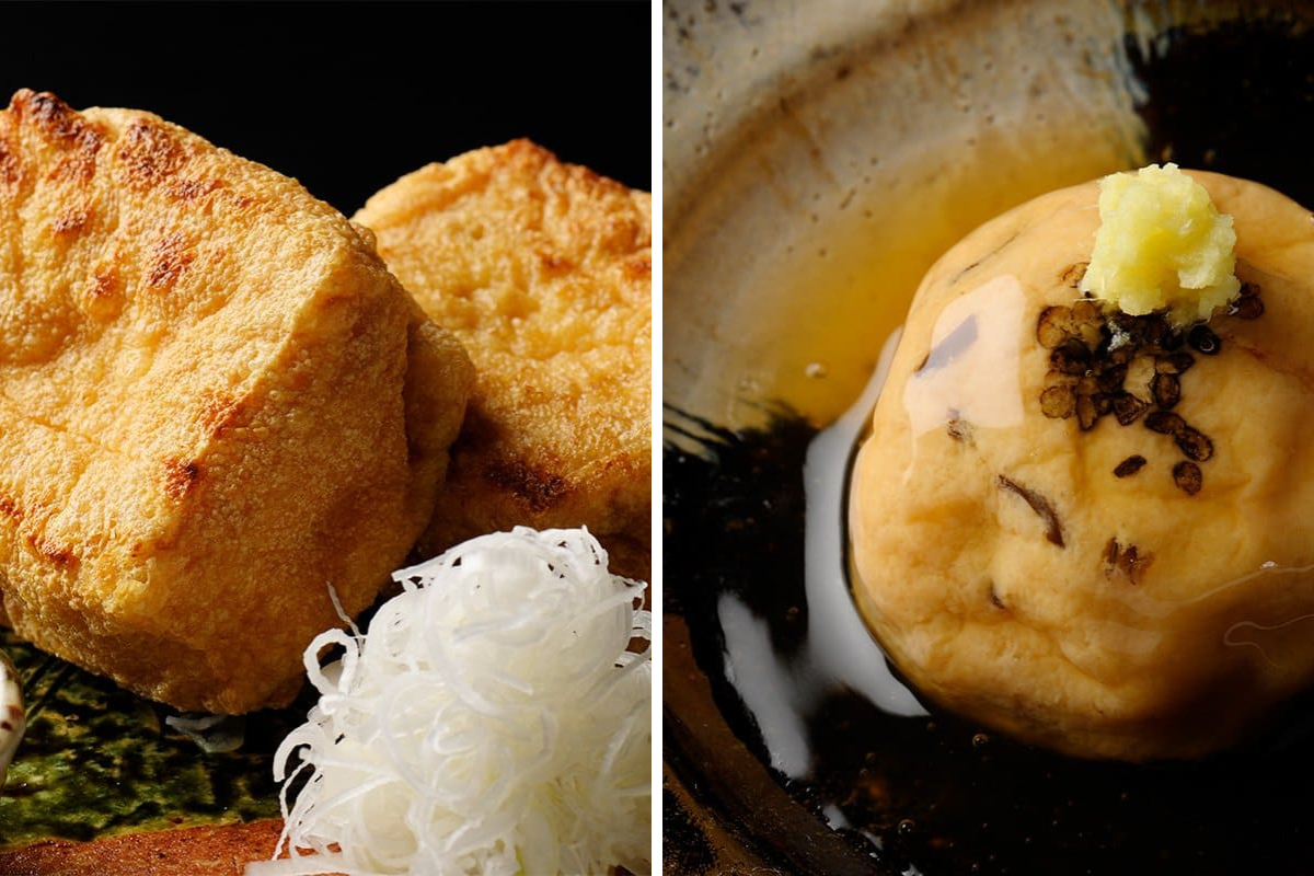 食べ応え満点大豆の風味がつまったどっしりとした「厚揚げ」は、昔ながらの浮かし揚げにこだわり、豆腐職人が丹精込めて仕上げました。低温と高温の油に浮かせ何度も返しながら1枚1枚じっくり揚げることで、大豆の甘みと旨みが凝縮した味わいに。「京がんも」は、うかい豆腐と山芋を合わせ、きくらげや人参を練り込み、ふんわりと仕立てた豆腐の甘みがうれしいがんもどきです。海老と百合根の2種類のお味をご用意しました。