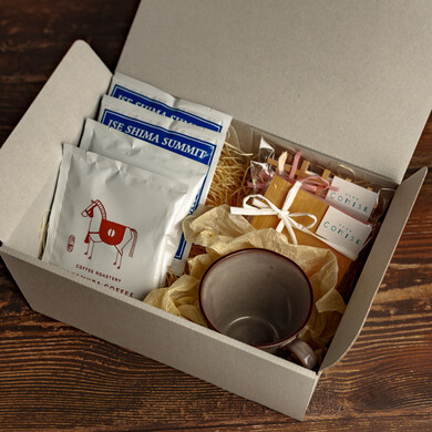 伊勢の魅力を感じられる「コーヒーギフトセット」です。伊勢にある珈琲店「なかむら珈房」のドリップコーヒー「伊勢志摩サミットブレンド」や、ディップスタイルコーヒー「神馬 -shinme-」に加え、温かみのあるデザインが特徴の「マグカップ」、そして伊勢の老舗神棚屋の木工技術が光る「ひのきコースター」がセットになっています。伊勢の温もりと上質さが詰まったギフトセットは、大切な人への贈り物にも最適です。