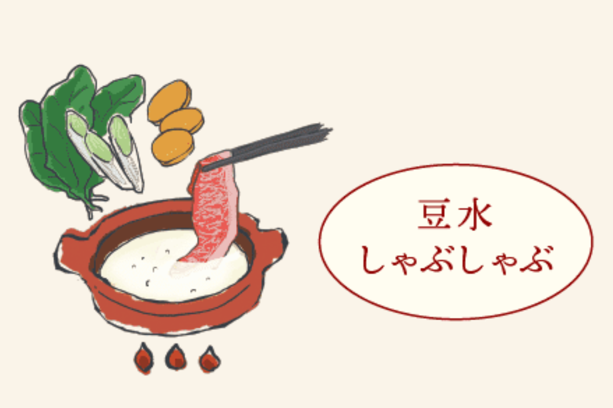 お勧めの〆の召し上げり方のその2は、豆水しゃぶしゃぶをご紹介します。お好みの肉や野菜をくぐらせ、しゃぶしゃぶにすることで、具材の旨みを「豆水」のマイルドな風味と共にお召し上がりいただけます。素材本来の旨みが引き立ち、豆乳のまろやかなコクが口の中に広がります。