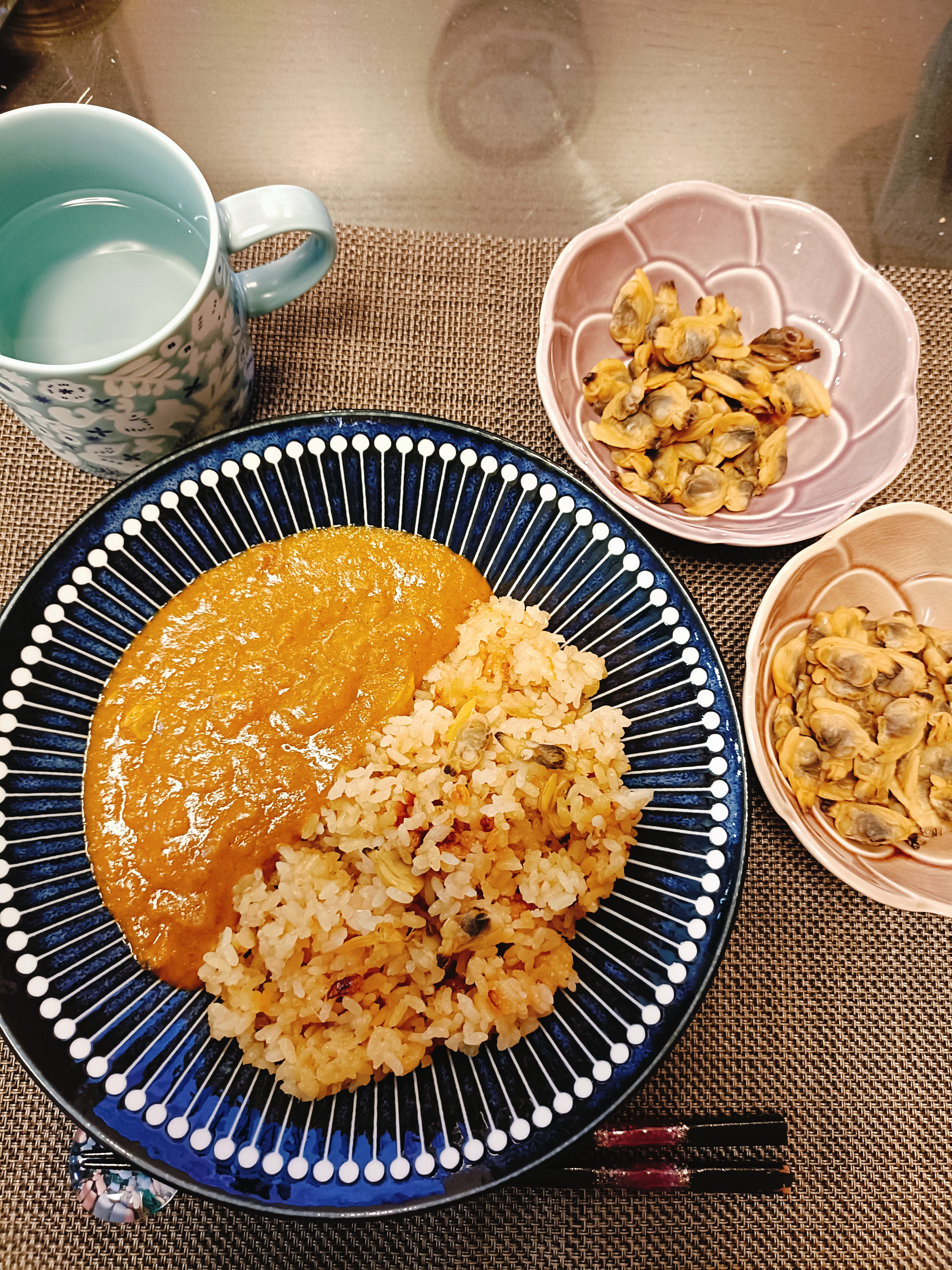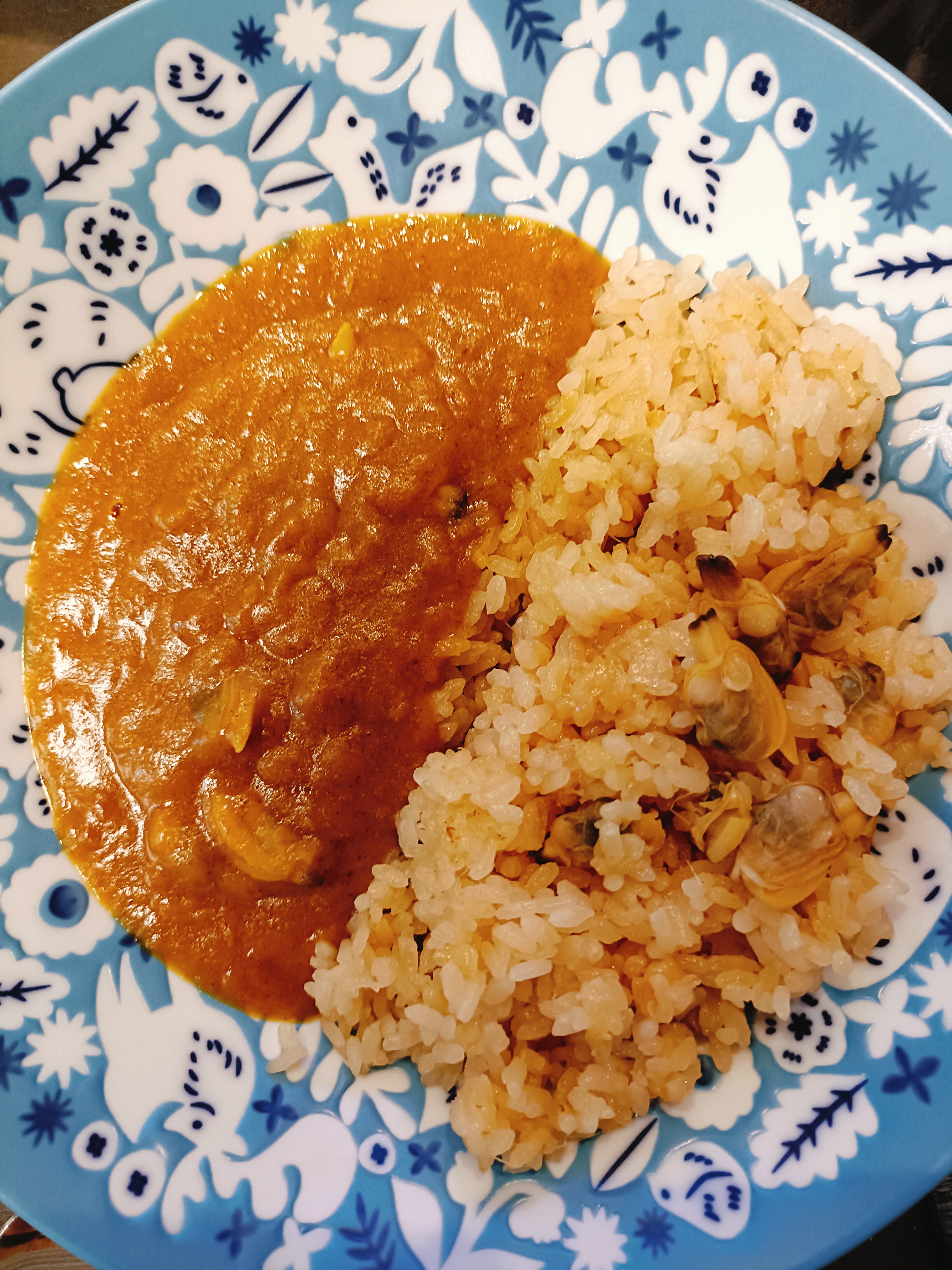 【アサリカレー】こちらも一口頂いた途端「これは!!!」というくらいおいしくて、何より市販のカレーによくありがちな油脂たっぷりのものではなく、あさり出汁とコンソメのよく効いたうまみたっぷりのカレー。
