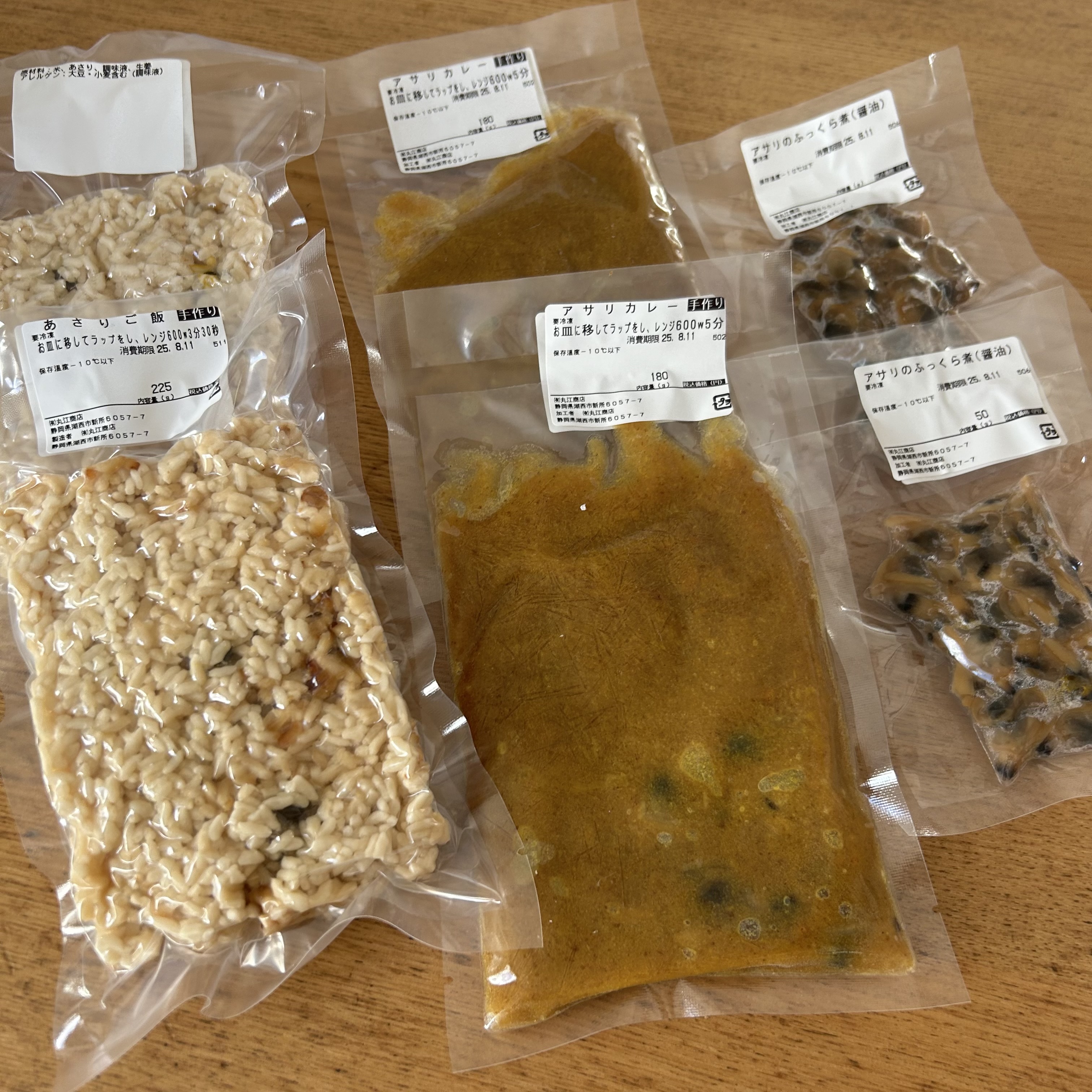 指定した日時に、冷凍便で・アサリご飯・アサリカレー・アサリのふっくら煮各2袋が入って届きました。
