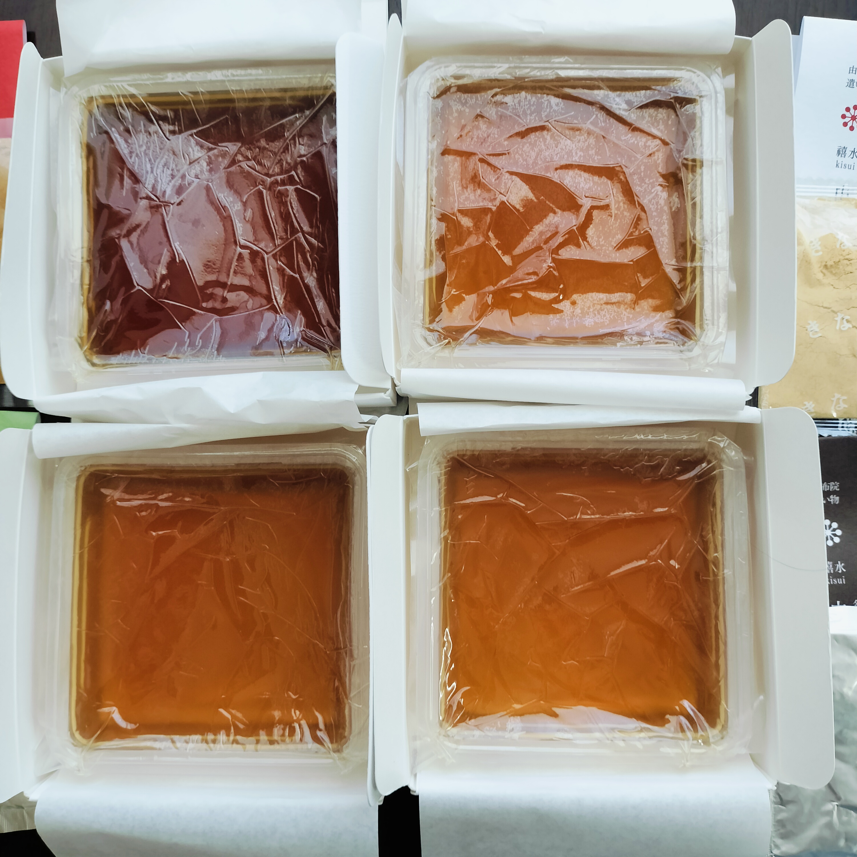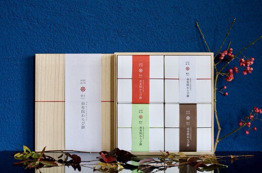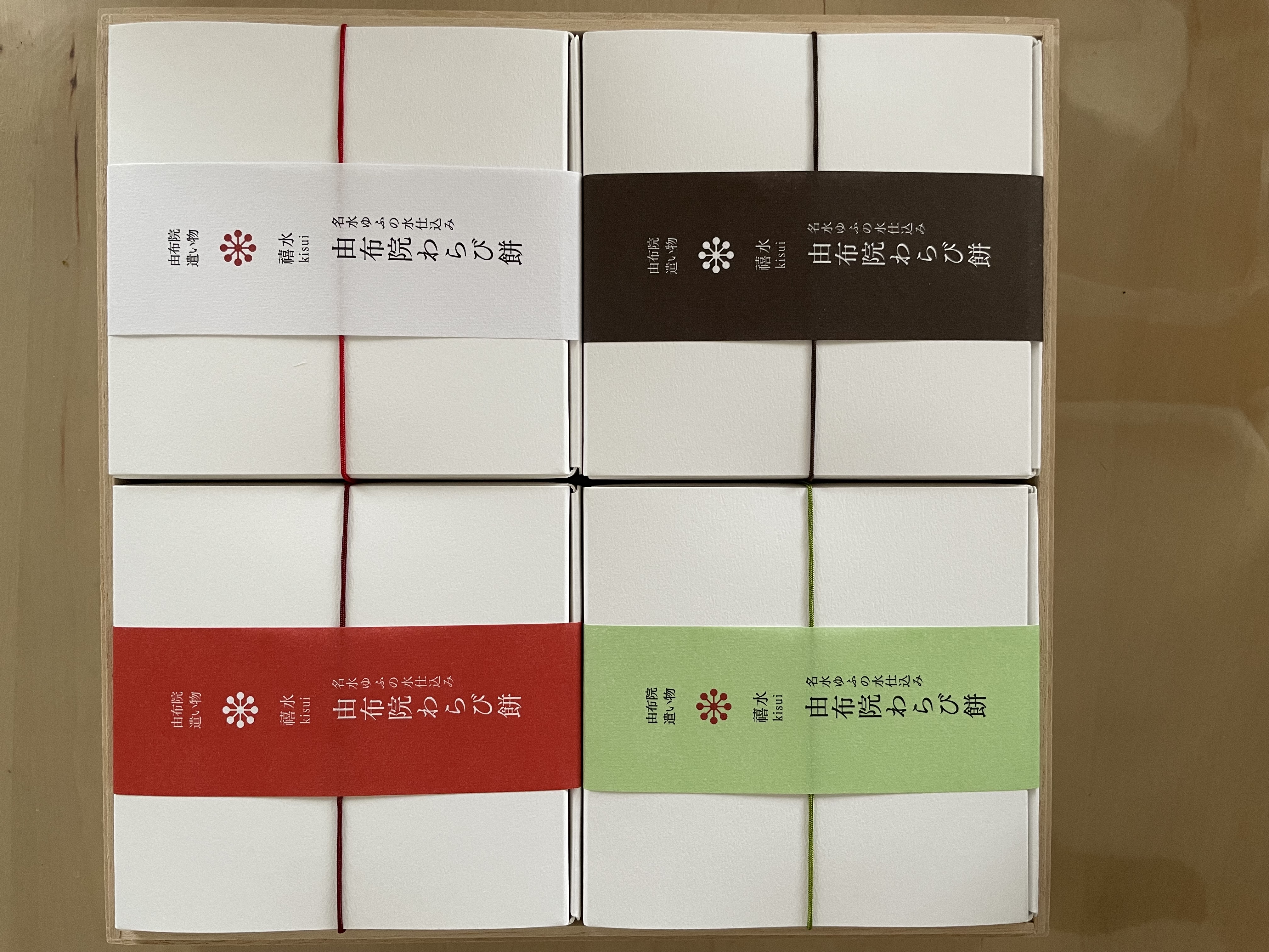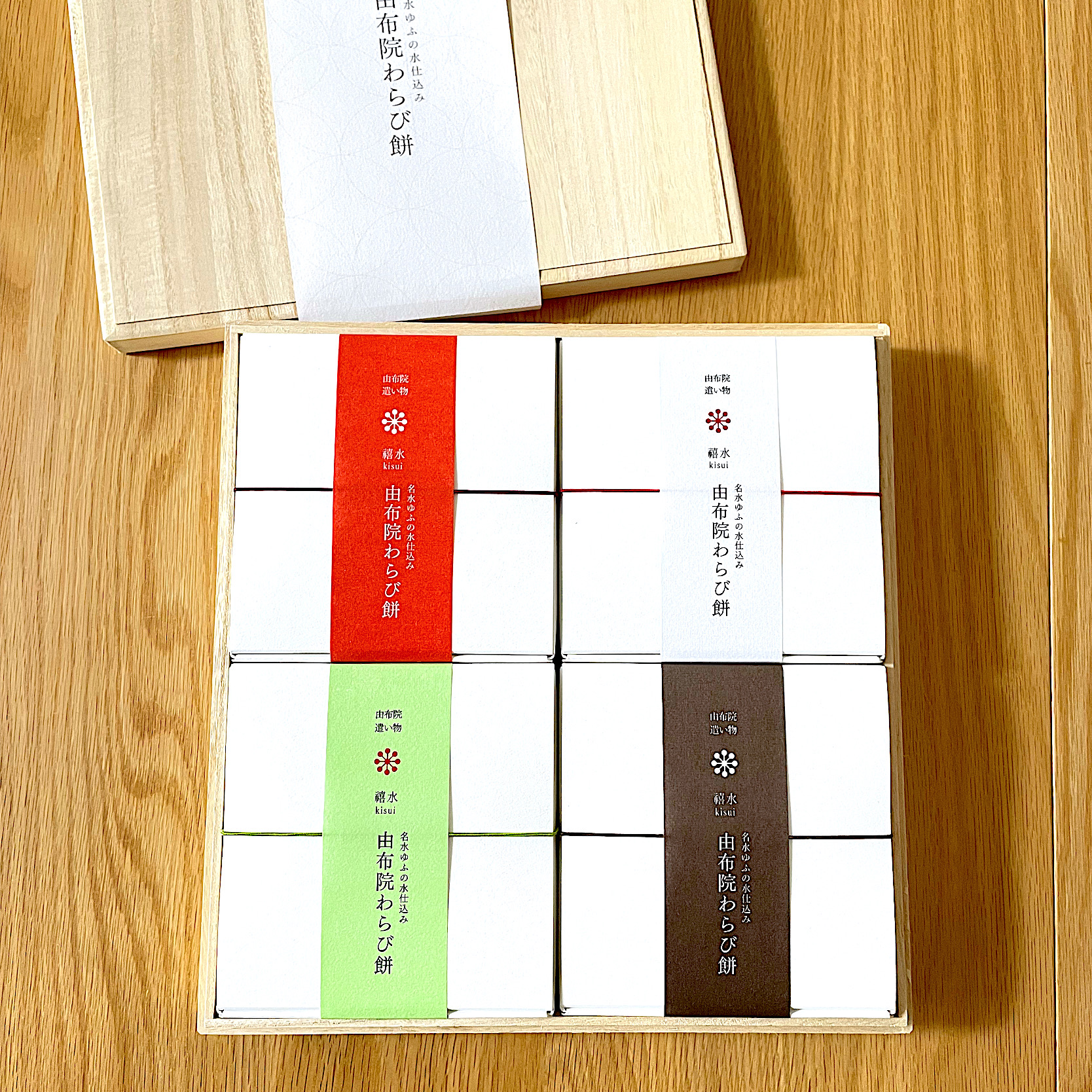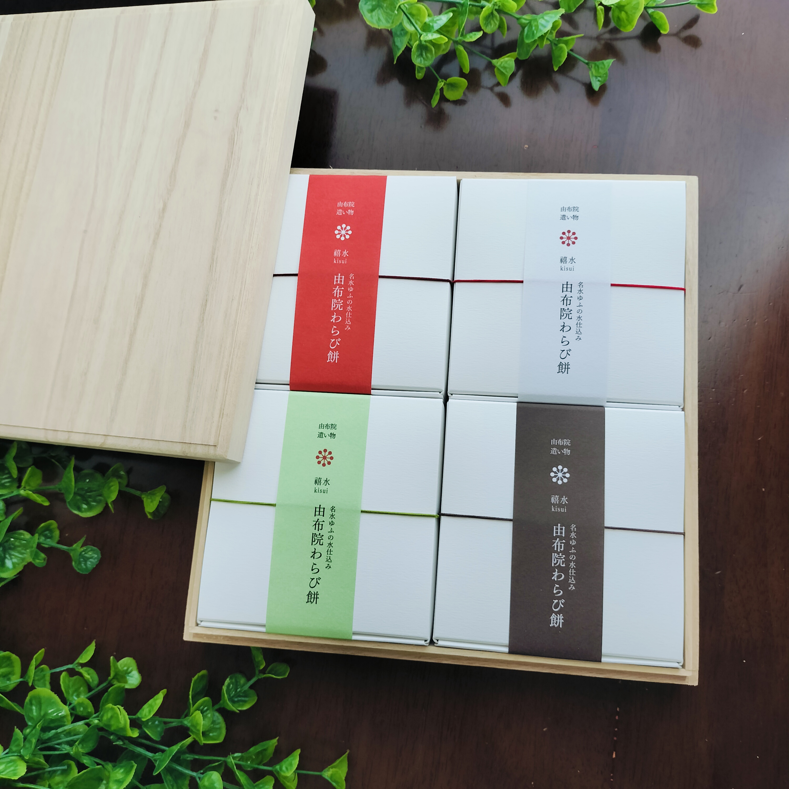 「由布院」のシンプルで飾らない自然の美しさを表現した「わらび餅」です。日本屈指の豊かな自然に恵まれた癒しの地・由布院。豊富に湧き出る源流の恵み・由布の天然水とわらび粉、てん菜糖、きな粉、黒糖、抹茶きな粉など厳選した国産素材のみを使用。添加物、着色料、保存料等は一切使用していません。長時間かけて手煉りでじっくり煉り上げることで、今までにない繊細な食感、とろける口どけ、上品な味わいに仕上がっています。香り高い「きな粉味」と黒糖のコクを感じる「黒糖きな粉味」、抹茶の香り漂う「抹茶きな粉」、カカオの風味が凝縮された豊かな香りの「チョコ味」4種がセットになっています。桐箱入りの上品なラッピングで届くので、贈り物にもおすすめです。