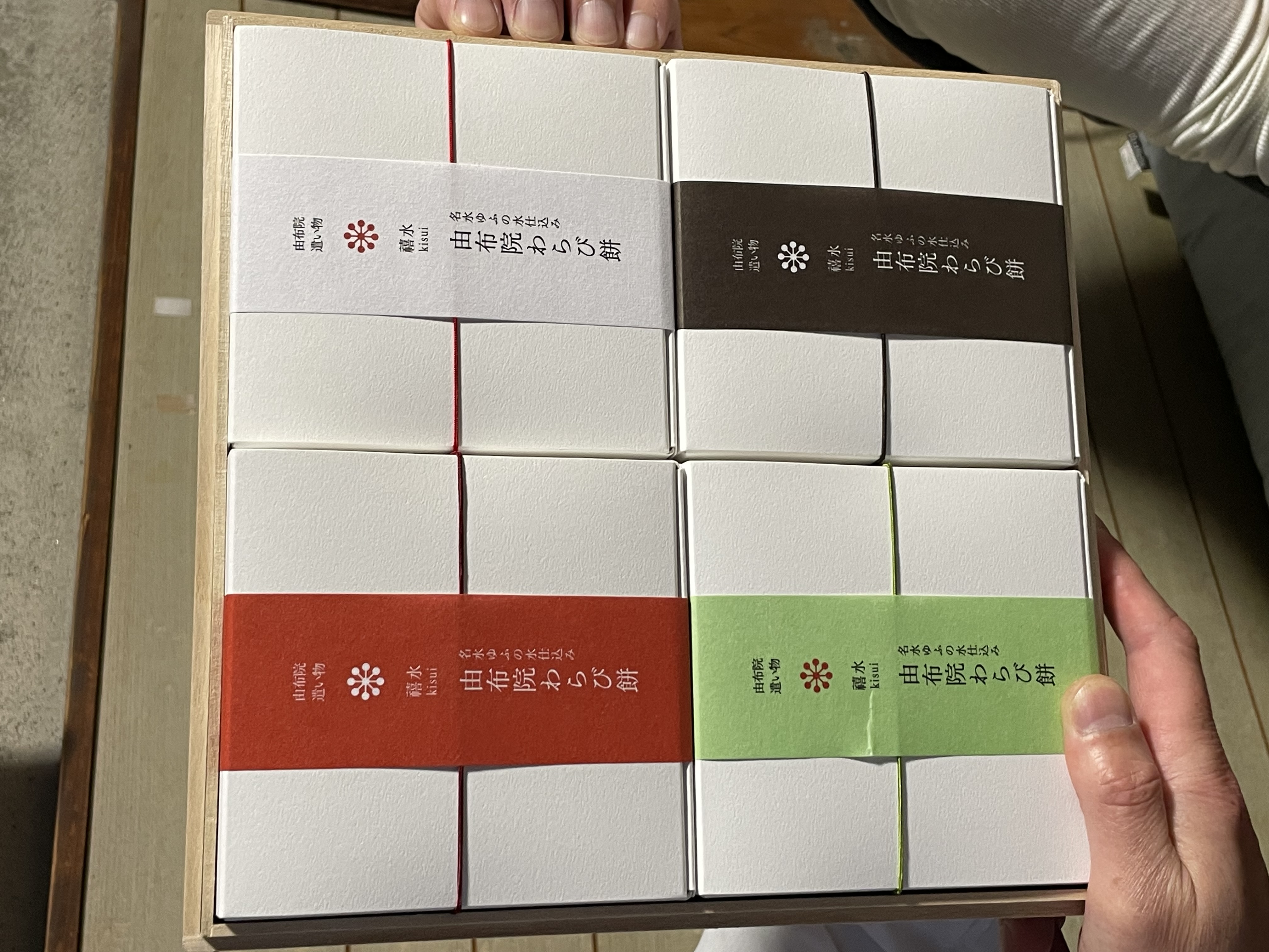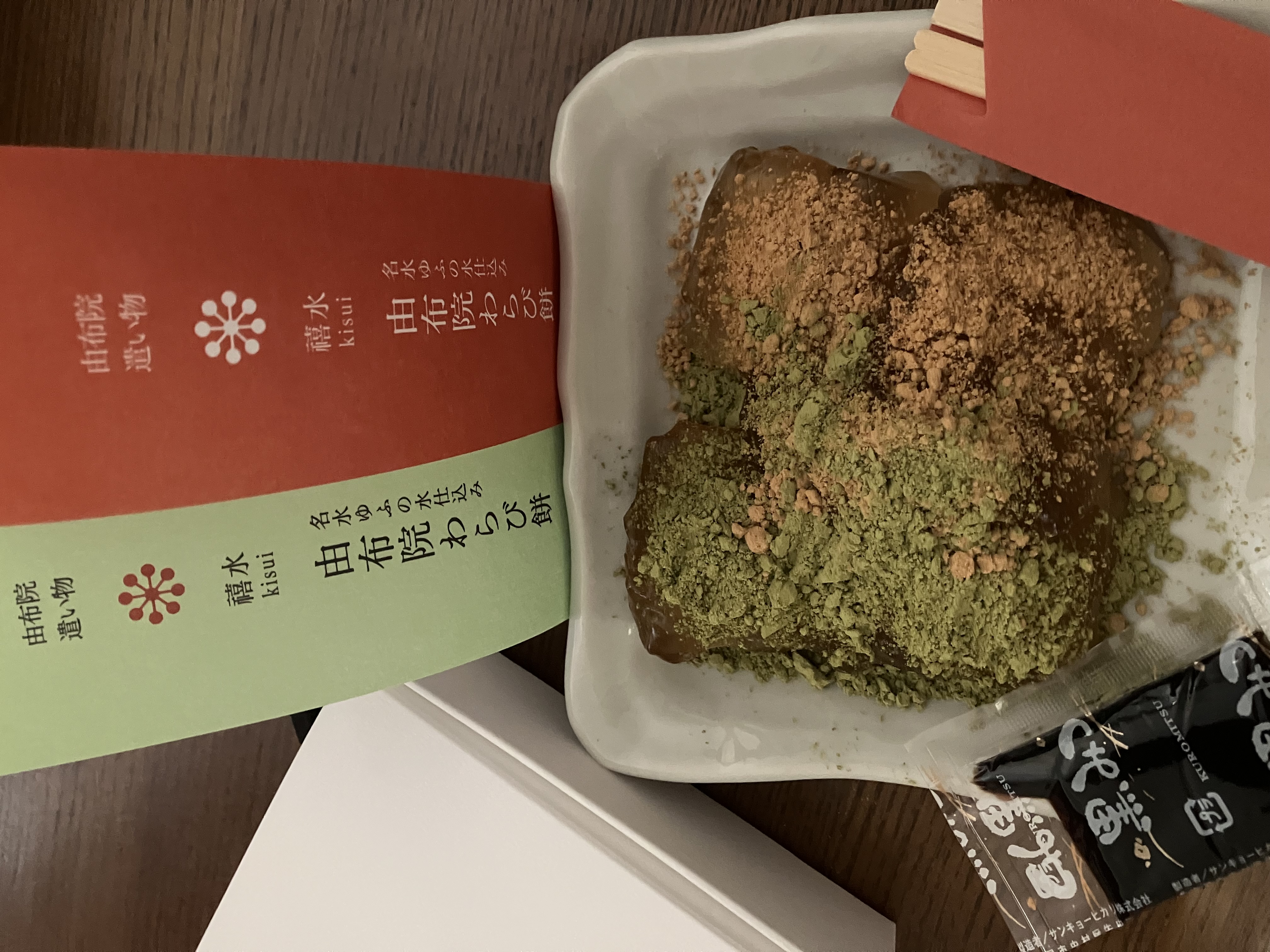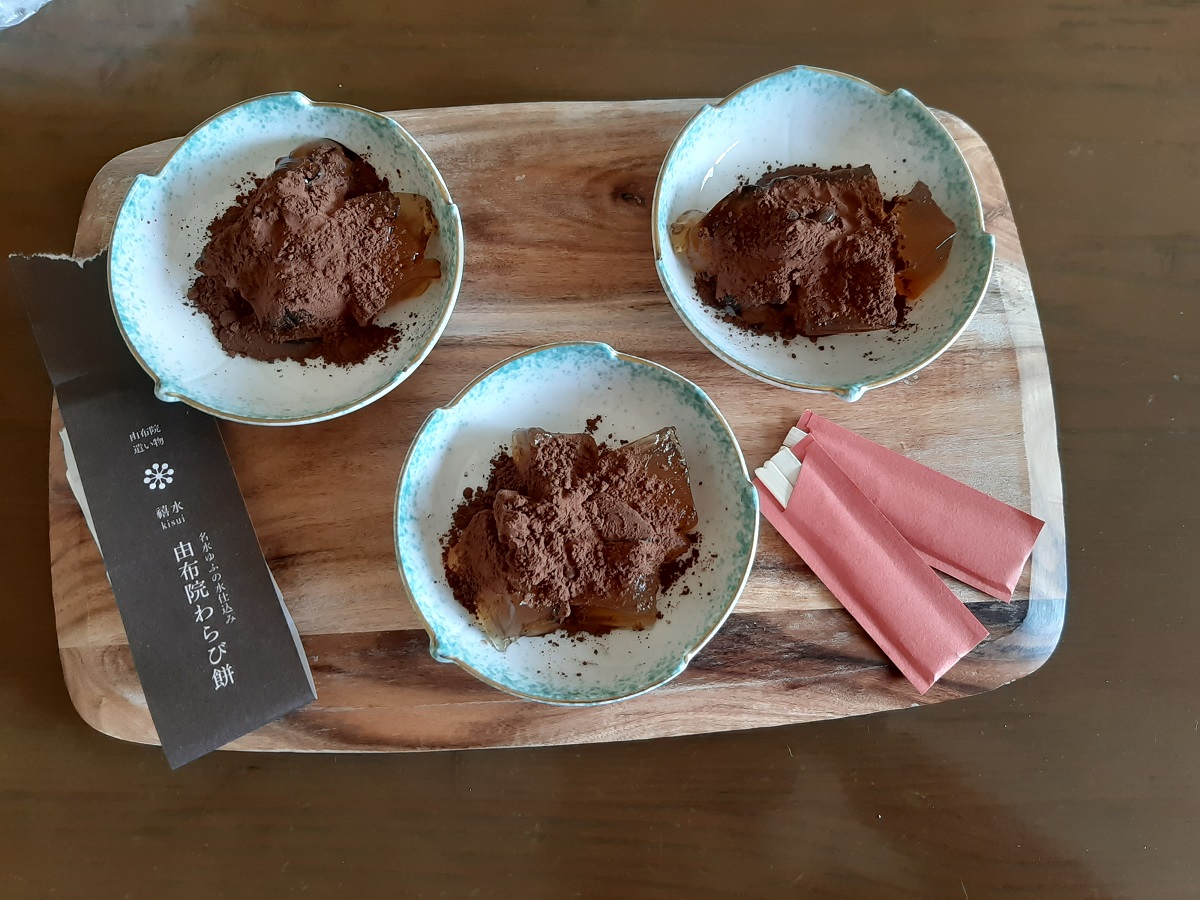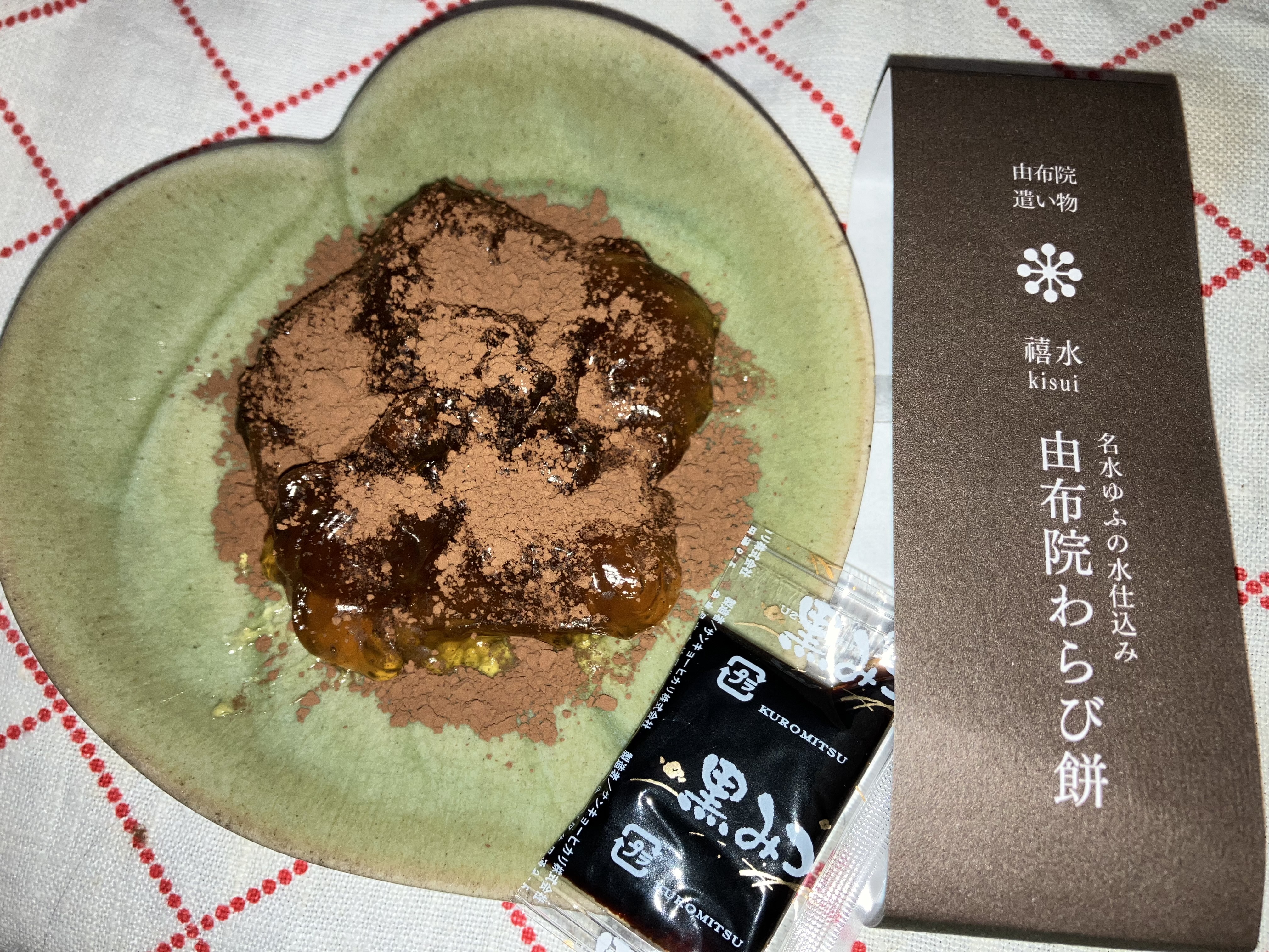 由布院の地下240mより湧き出る名水ゆふの水仕込みのわらび餅です。