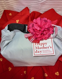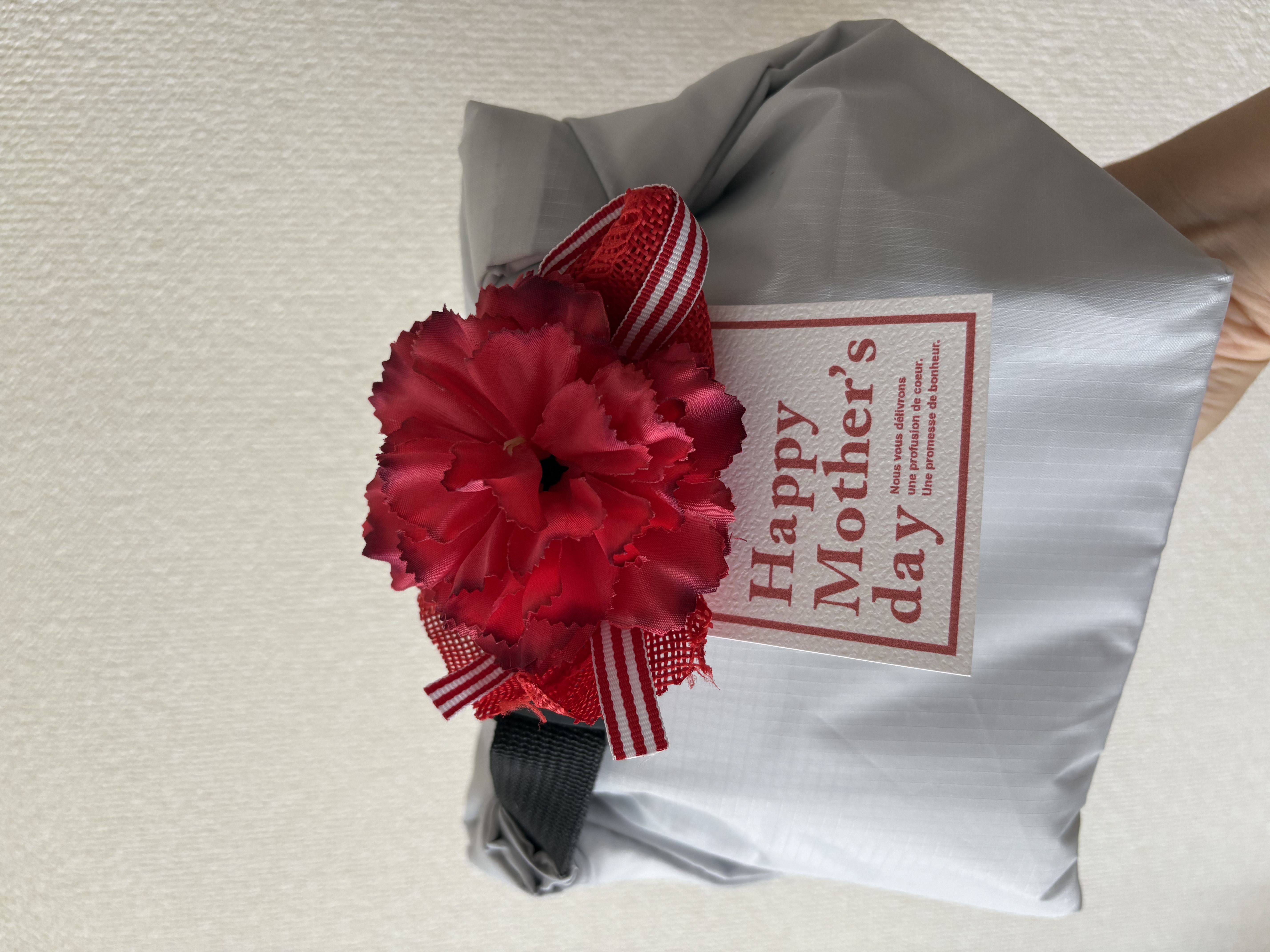 母の日のプレゼント用に装飾された冷凍バッグとカスタード、チョコ、ストロベリー、抹茶の4種類のドーナツがセットになっていて、母の日のギフトにぴったりです。