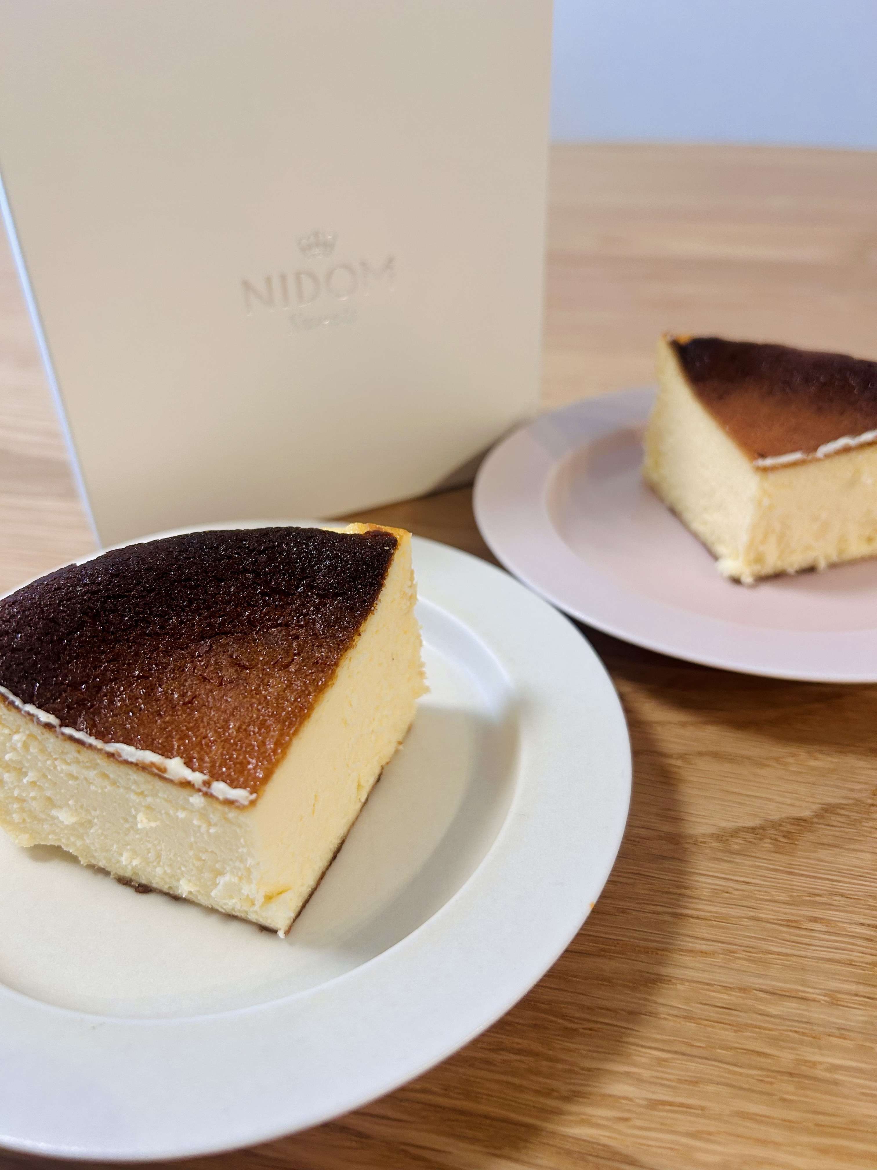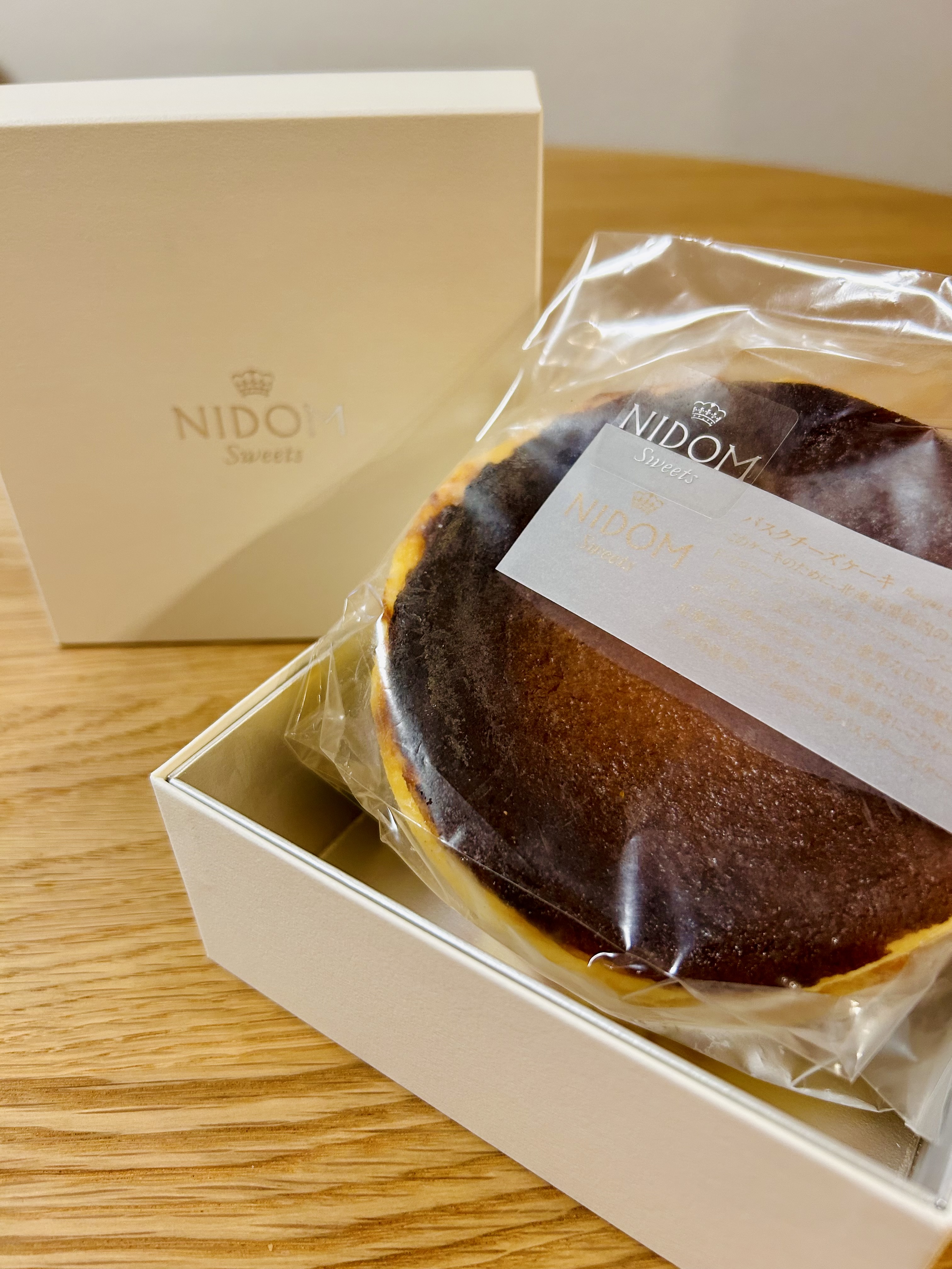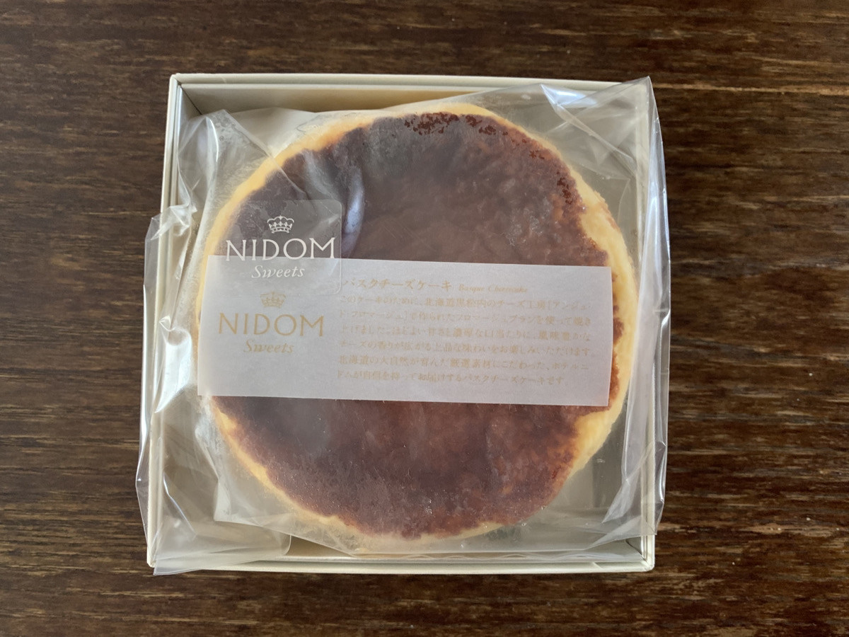 北海道産のフレッシュチーズを使用し、「ホテルニドム」のエグゼクティブシェフパティシエが作った「バスクチーズケーキ」です。北海道黒松内のチーズ工房「アンジュ・ド・フロマージュ」で、ホテルニドムのバスクチーズケーキ用に製造したフロマージュブランと、厳選したチーズをブレンド。焼き時間や温度を試行錯誤し、口の中でとろけるような食感に仕上げています。上品なボックスに入って届くため、贈り物にもおすすめです。