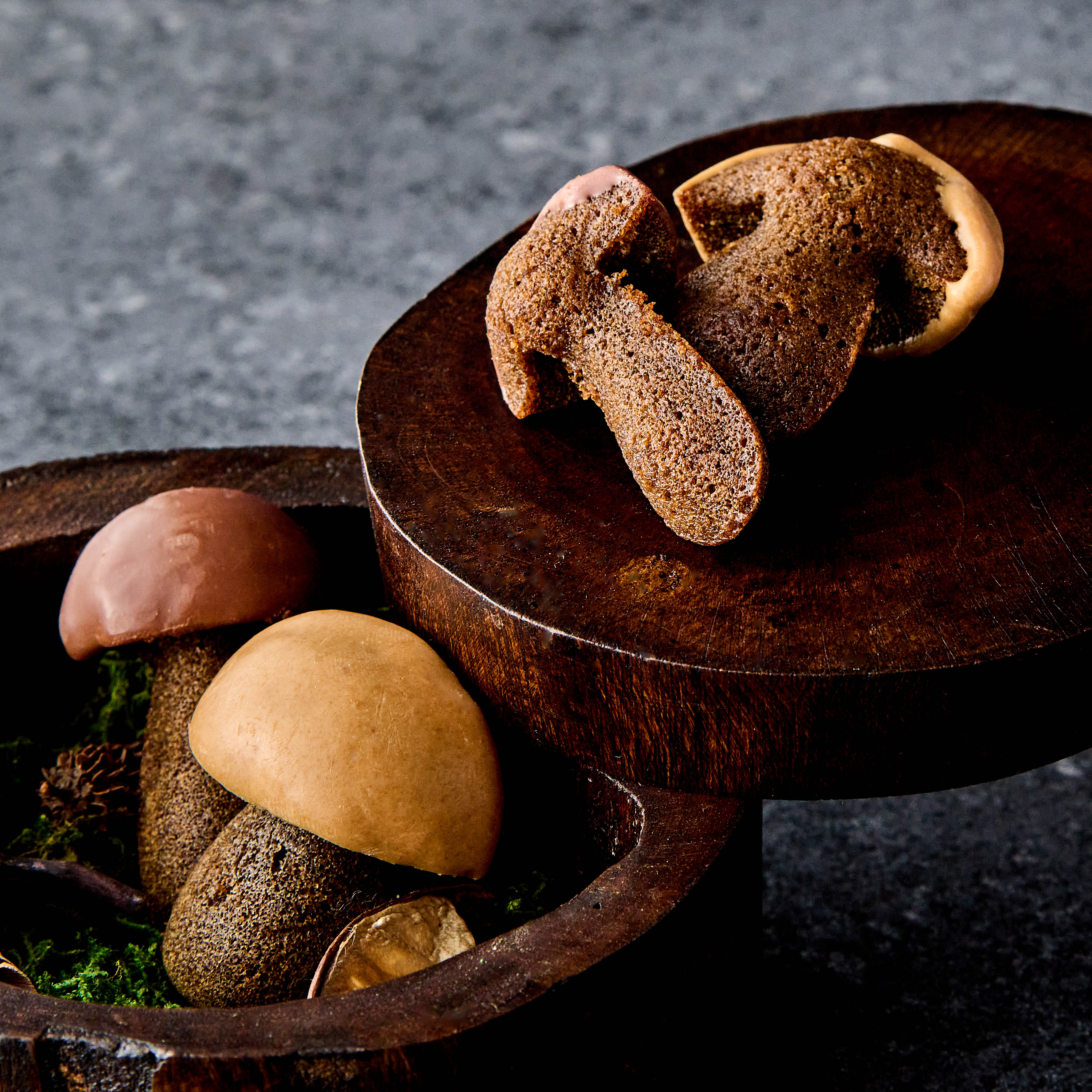まるで本物のキノコのような「フィナンシエ」です。レストランでのみ販売されていた商品ですが、購入の依頼が多数あったため、オンラインでも販売を開始した商品です。生地にはイタリア産ポルチーニを使ったパウダーを混ぜ込み、塩で味を引き締めています。かさの部分はポルチーニの色に似せた2種類のチョコレートでコーティングしています。ポルチーニの代表的なずんぐりむっくりと細長い形の2種類に焼き上げています。上品なブラウンのボックスに入って届くので贈り物にもおすすめです。