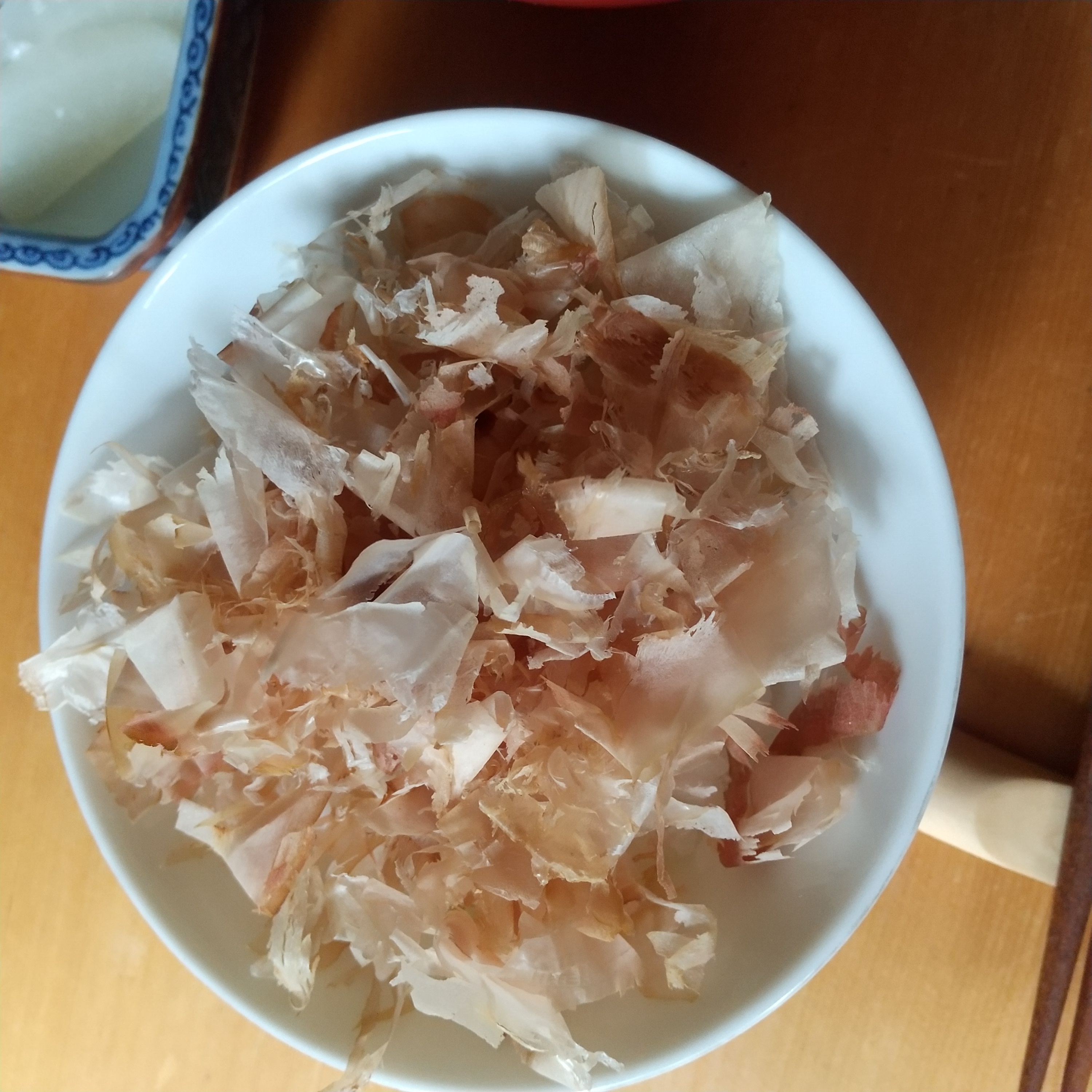 炊き立てのご飯にたっぷりと鰹節をかけて醤油をひとかけ。