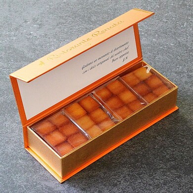 塩レモンの香りに蜂蜜の優しい甘みを加えた「塩レモンハニーフィナンシェ」です。愛媛の無農薬レモンをイタリアの海塩でマリネして発酵させた塩レモンソースを生地に練り込み、焼き上げています。レモンを塩漬けにすることで酸味の角が取れ、穏やかな味わいに変化します。蜂蜜の甘さで包みこんだレモンの旨味も楽しめるバランスが魅力です。キューブ型の一口サイズのフィナンシェが24個入っています。豪華なボックスに入って届くので、贈り物にもおすすめです。