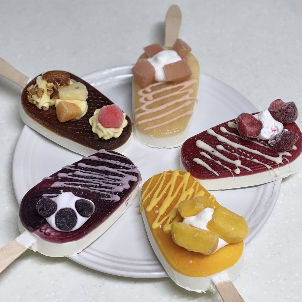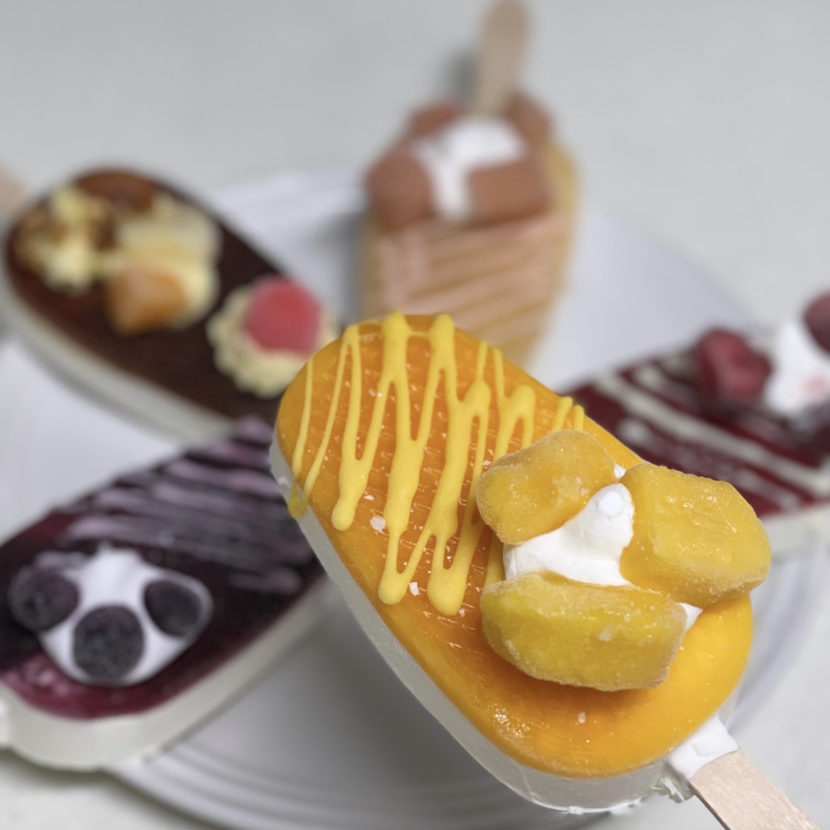 パフェアイスバーを再現するため、チョコレートをソースに見立ててトッピングしました。