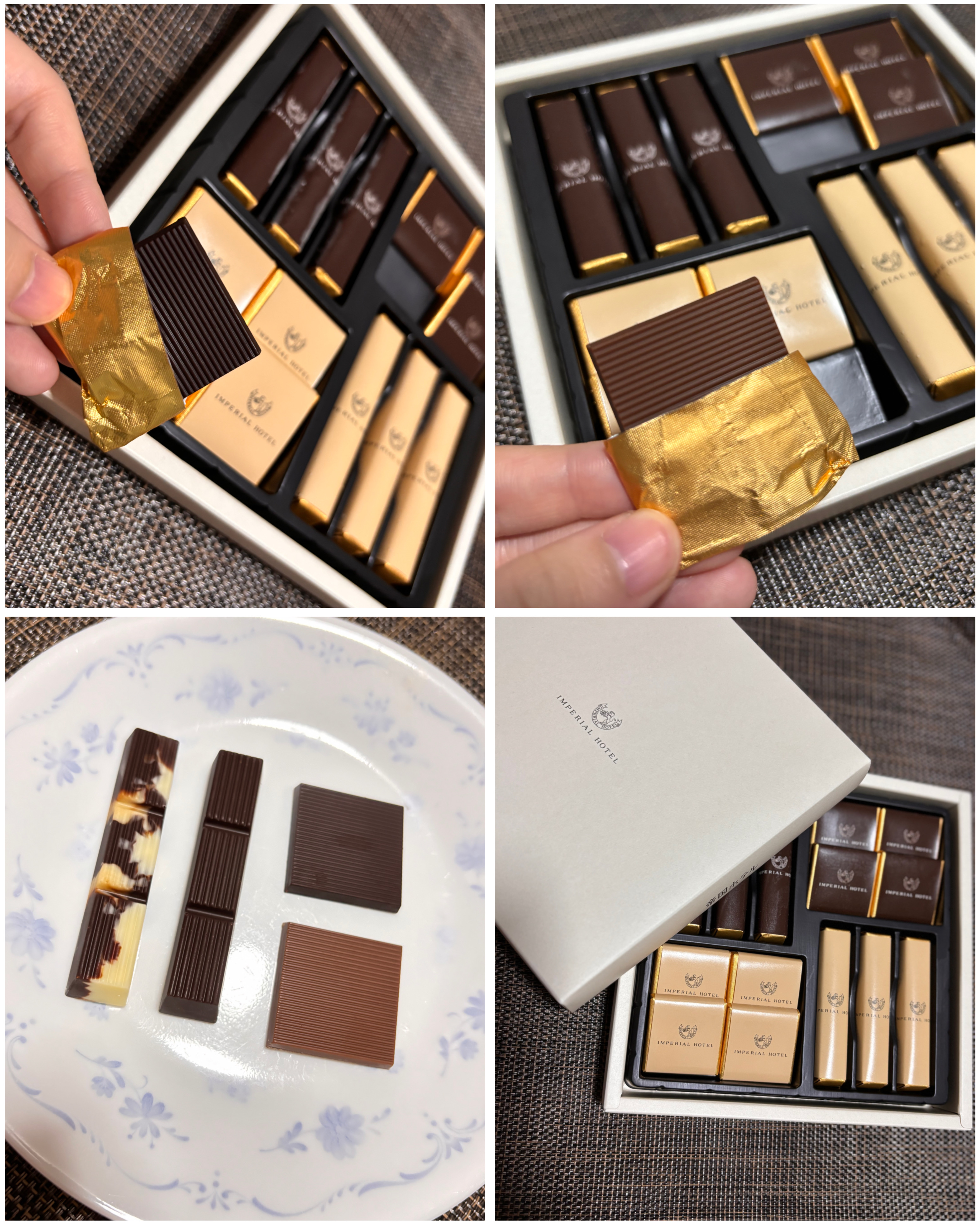 帝国ホテル2代目本館(通称「ライト館」)の外壁のスクラッチタイルを模した、ビターとマーブル2種類のスティック型チョコレートと、ビターとミルク2種類のプレート型チョコレートの詰め合わせです。スティックチョコレートは、ほどよい厚みの歯応えが特長で、プレートチョコレートは、滑らかな口溶けを楽しめます。自宅用にはもちろん、手土産や贈り物にもおすすめです。