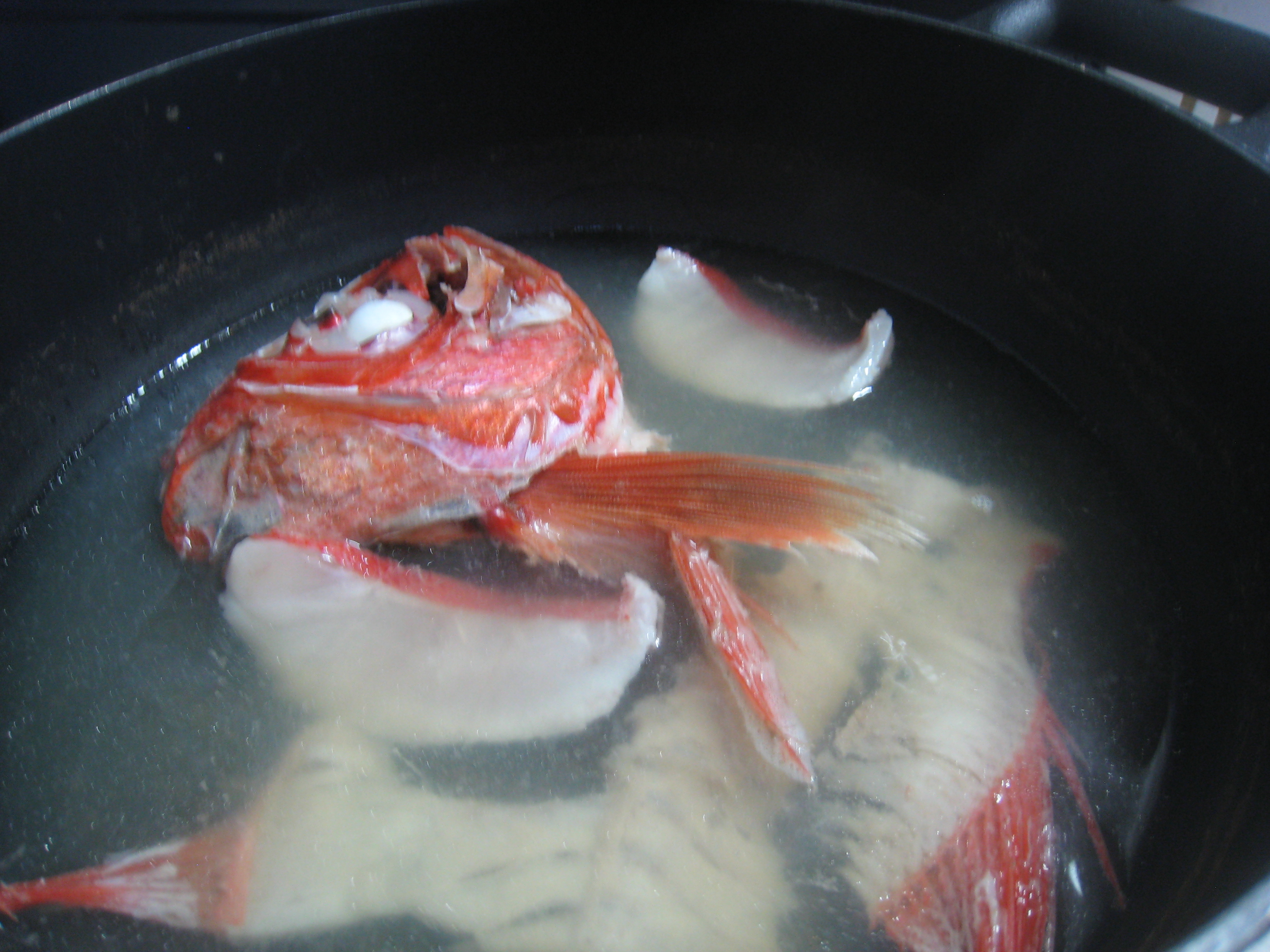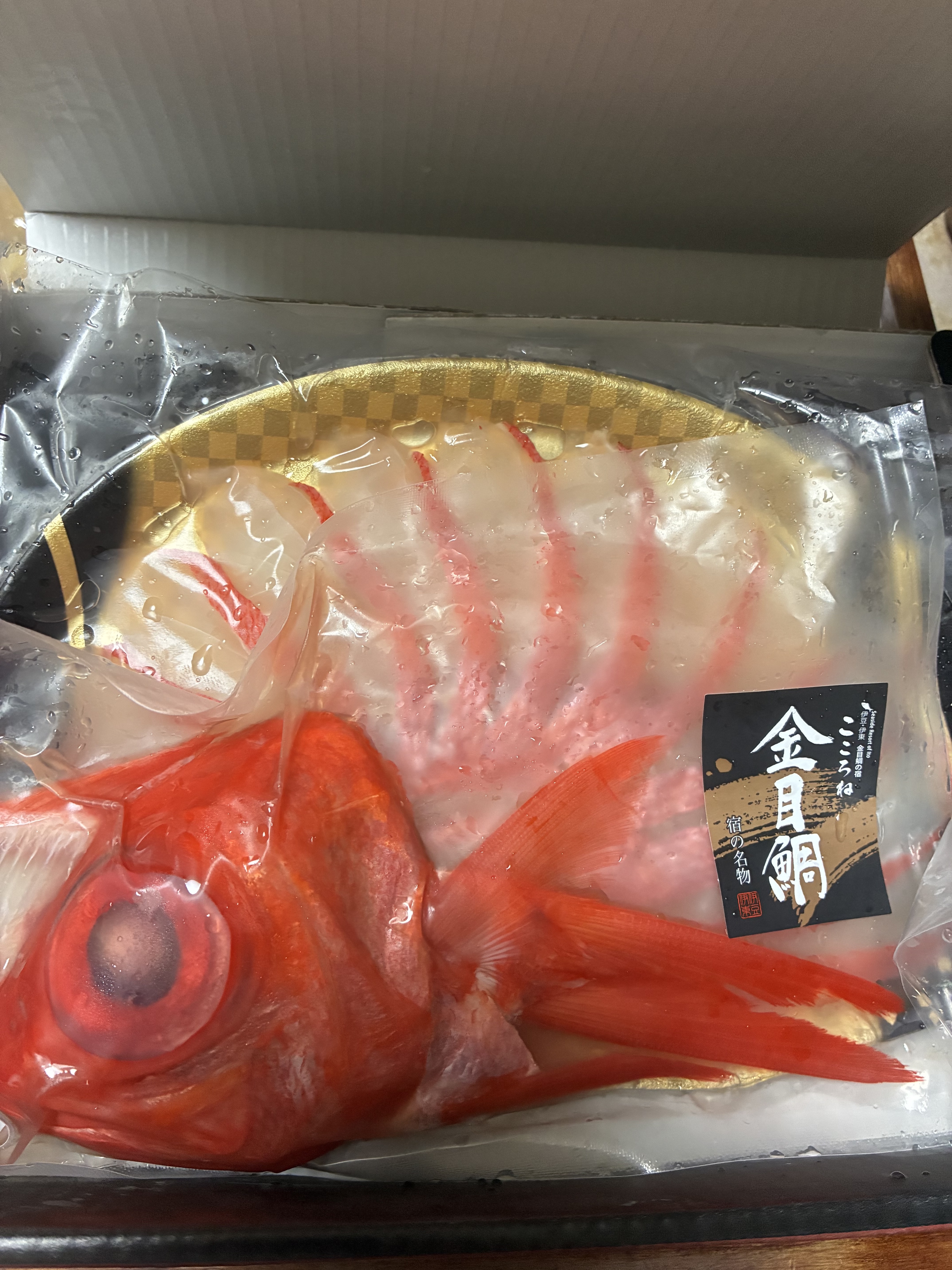 真空パックで届いたのはしゃぶしゃぶの金目鯛の切り身とお出汁用のあら、出汁のセットでしたが、鯛が赤く光り輝いていて開封するなりワクワクした気持ちに。これは贈答品としてもぴったりだと思います。