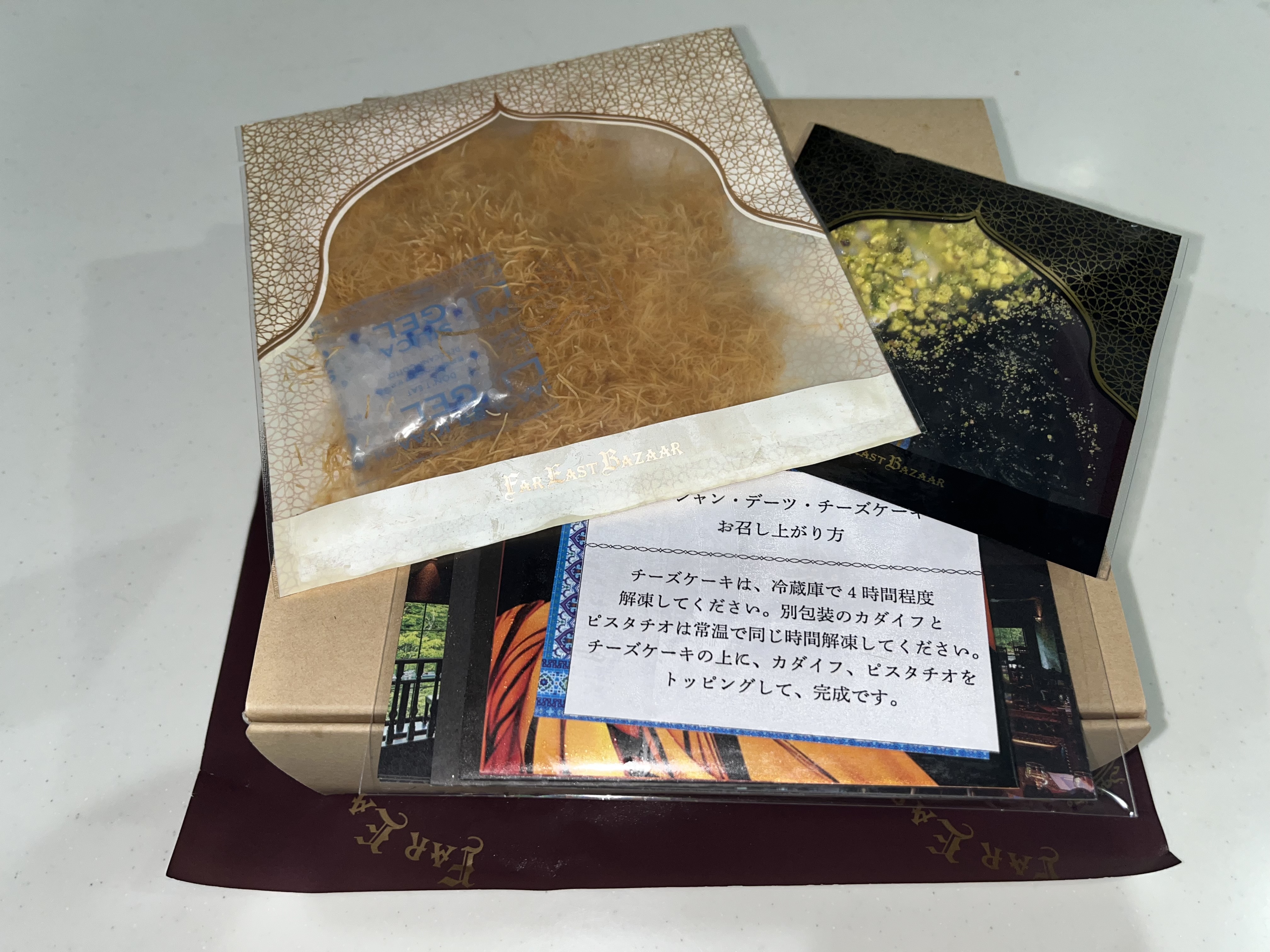 エジプシャンデーツを使用した「チーズケーキ」です。9000年の時を超えて今もなお「生命の果実」として親しまれるエジプト産「デーツ」。かつて王妃の美容食とされていた果実を、チーズケーキに仕立てています。しっとりと濃厚なチーズケーキ生地には、黒糖のように深く上品な甘さのデーツをたっぷり練り込み、仕上げには香ばしいピスタチオと中東の伝統菓子「カダイフ」をトッピングしています。ひと口で、まるで砂漠のオアシスを旅するような異国の余韻が広がります。見た目も華やかな商品なので、贈り物にもおすすめです。