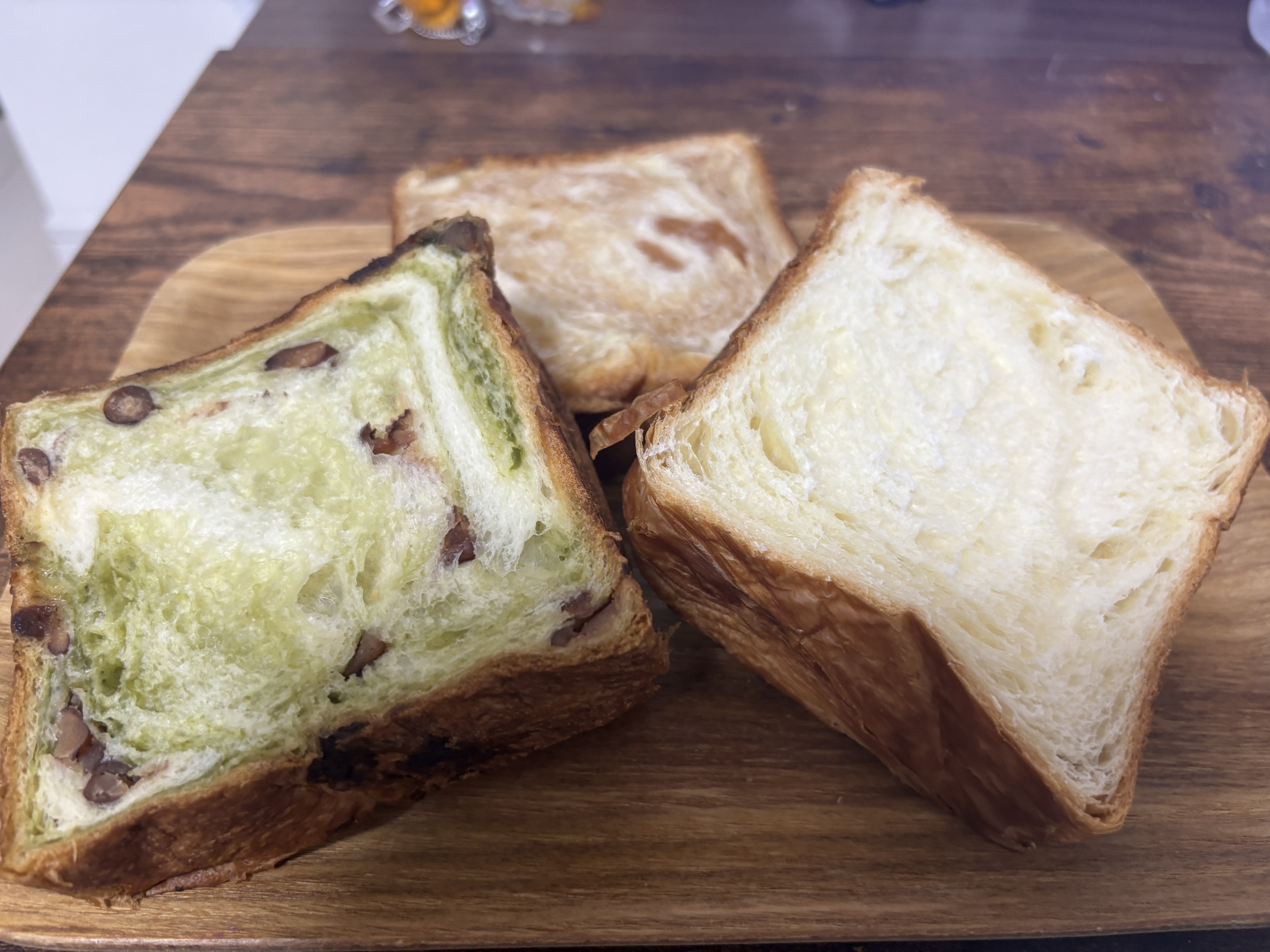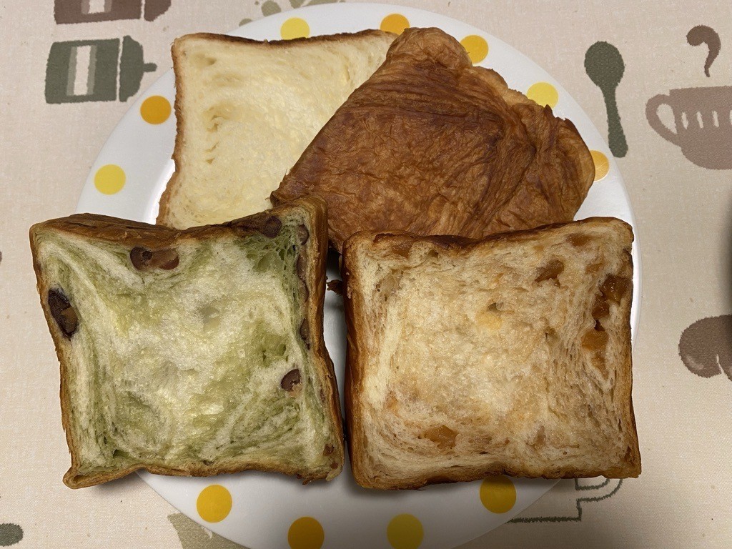 「京の抹茶小豆デニッシュ食パン」は抹茶の風味が程よく感じられ、抹茶のほろ苦さで小豆の甘みが引き立ちます。