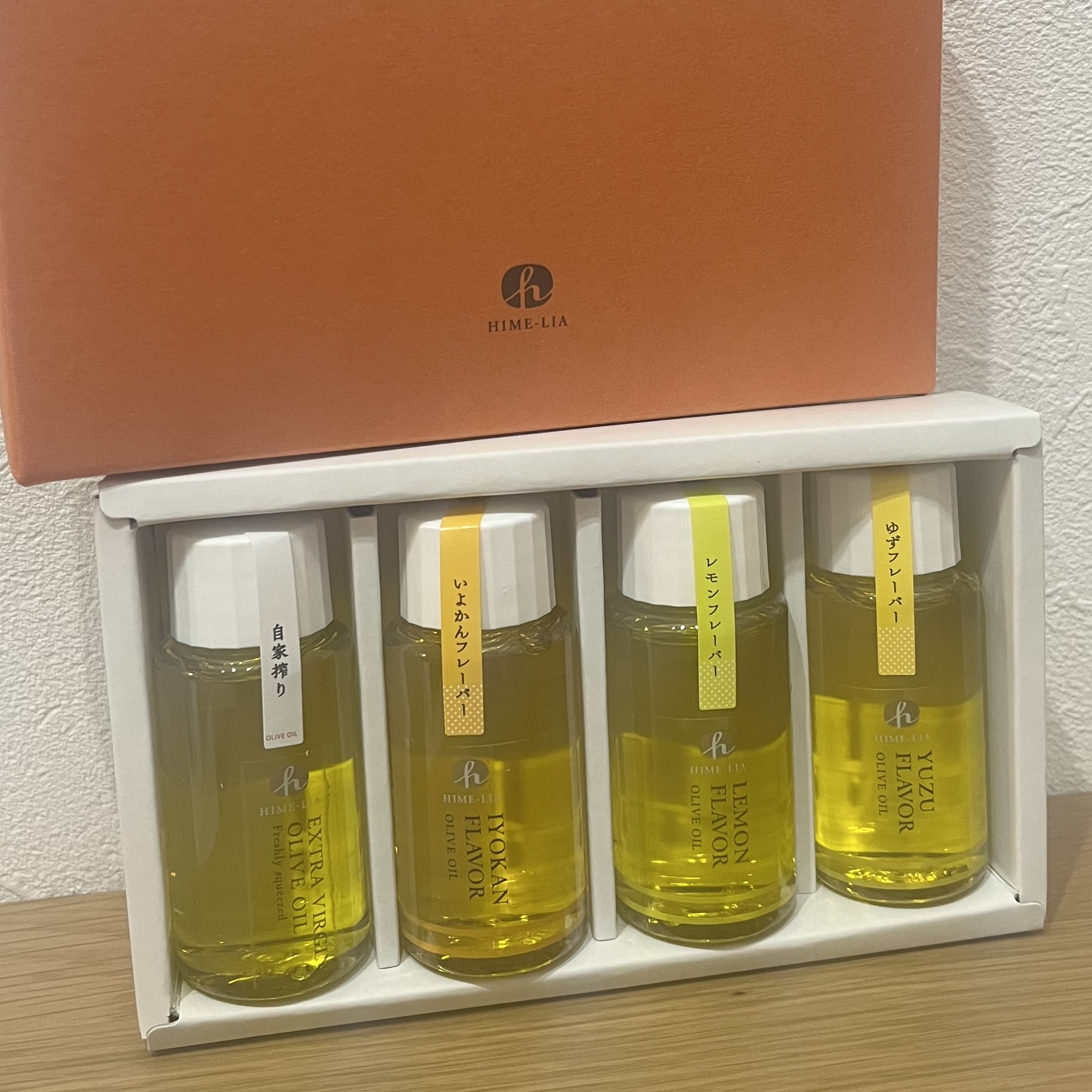 自家搾り(プレーン)エクストラバージンオリーブオイルと、柑橘の香り高いフレーバーオリーブオイル(イヨカン・レモン・ユズ)のミニ4本セット。