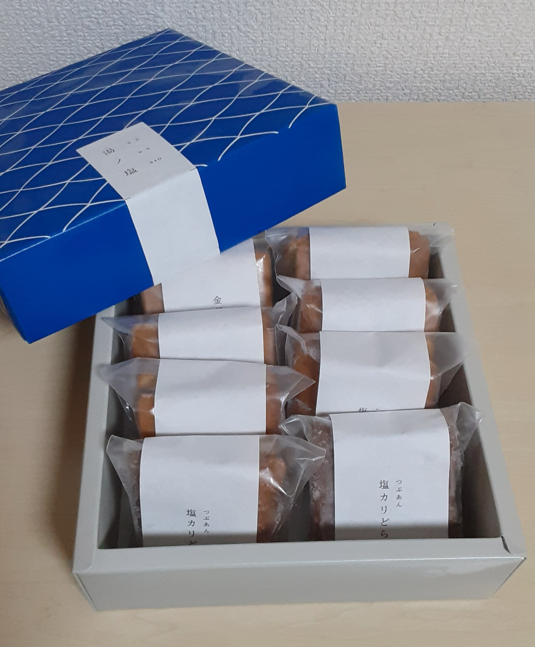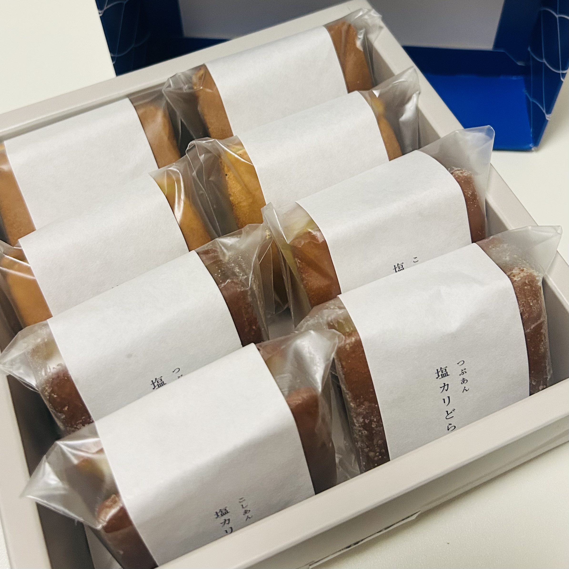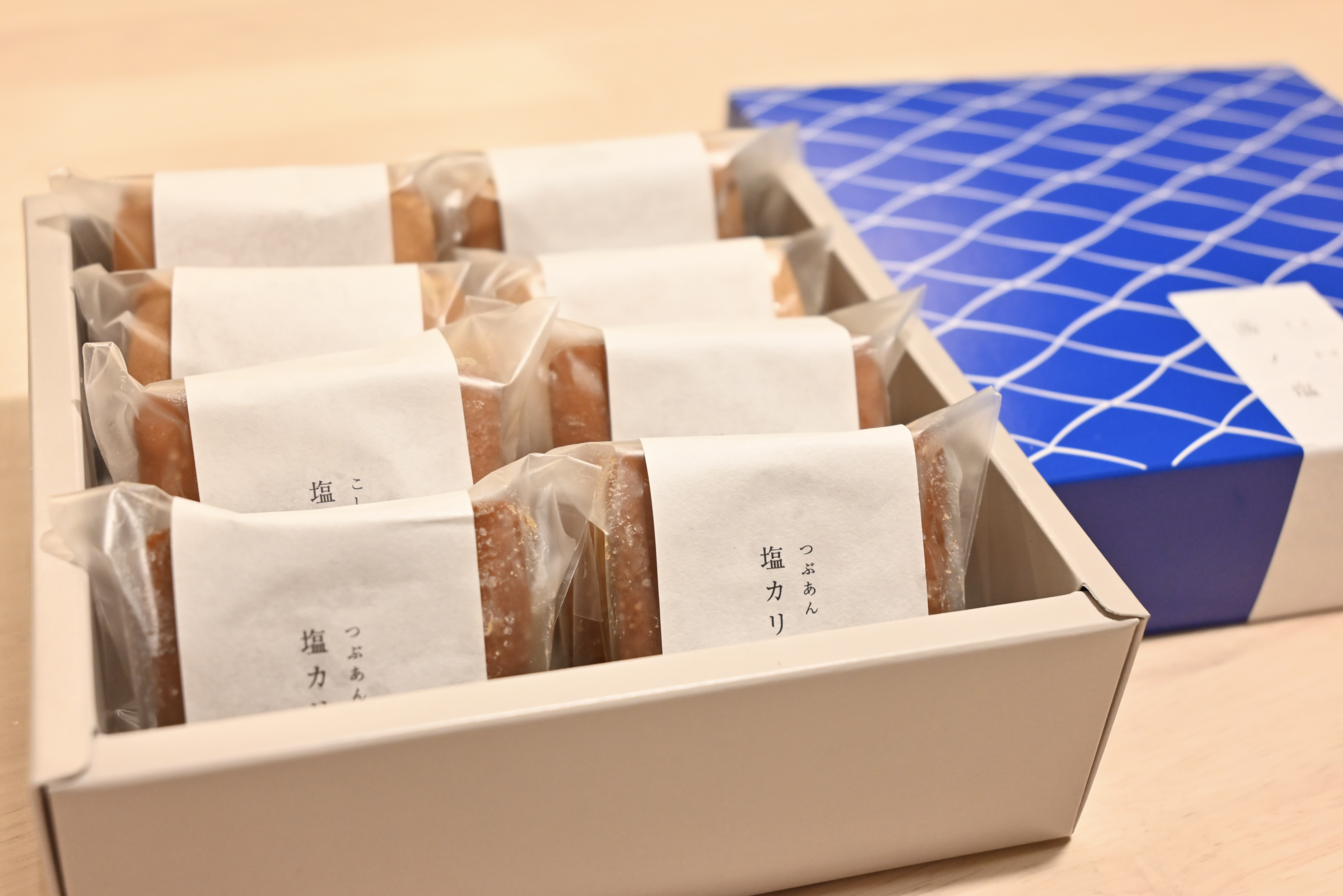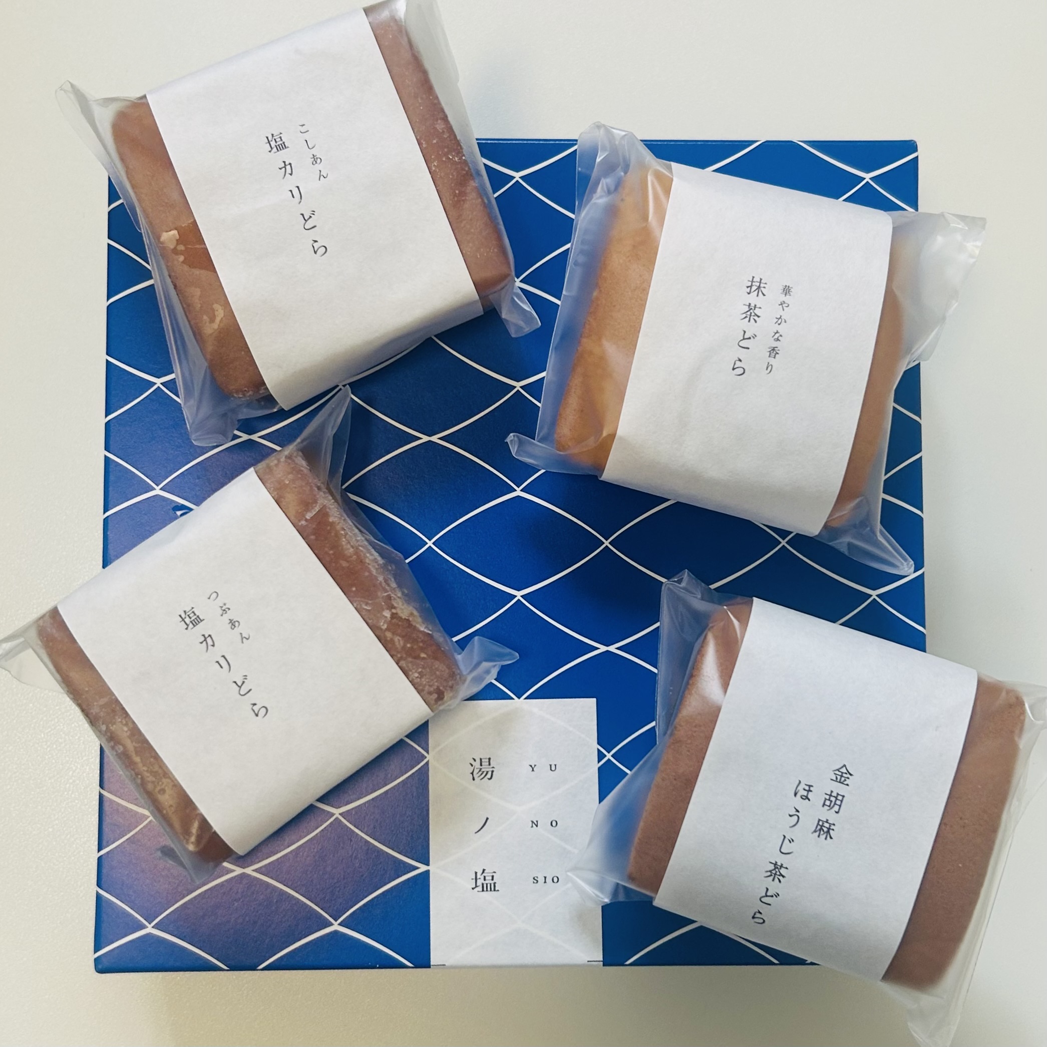 どら焼き専門店の「塩バターどら焼き」です。隠し味として自家製塩を使用しています。餡は鳥取県産の大納言小豆を使い、地域の食材を活かした味わいを引き出しています。自家製塩と鳥取県産バターをどら焼きの皮の表面に塗り、カリっと焼き上げた「塩カリどら(粒餡・こし餡)」、鳥取県大山町の井上青輝園産の最高級抹茶「青輝」を使った「抹茶どら」、ほうじ茶餡に直火焙煎の有機金ごまを練り込んだ「金胡麻ほうじ茶どら焼き」の4種セット。異なる味わいを食べ比べできるたのしさがあり、鮮やかな青色のギフトボックス入りなので贈り物にもおすすめです。