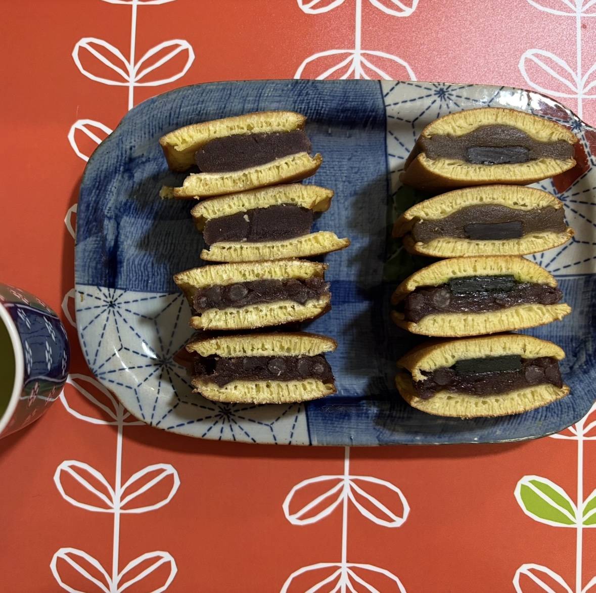 抹茶どら焼き・金胡麻ほうじ茶どら焼きには鳥取県大山町の高級抹茶、ほうじ茶を使用して香り高い逸品に仕上げています。また、中は餡子とバターの2層になっていて、冷蔵だとしっかりバターの固形の食感が感じられ、20度の常温だとバターが柔らかくなり餡子となじみます。