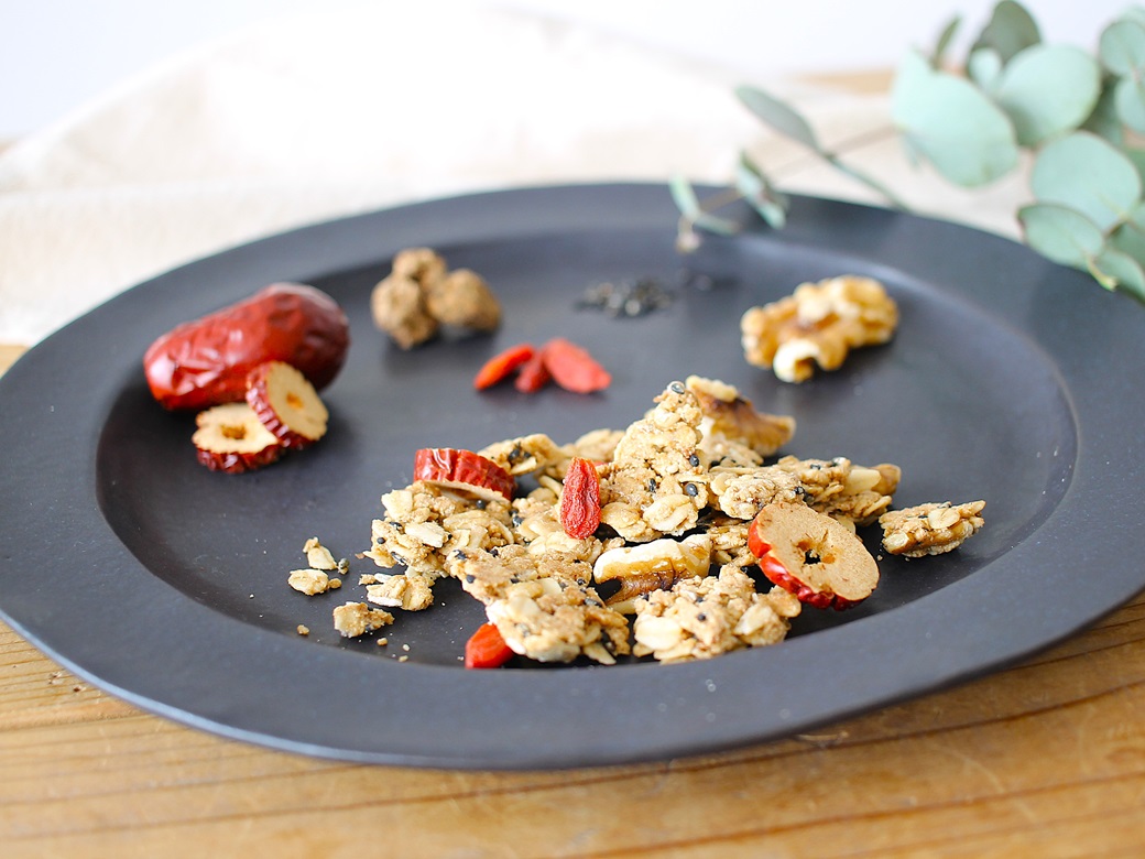 薬膳食材として使用される、 黒ごま、黒糖、生姜、ココナッツオイル、 ドライなつめ、 ドライクコの実やくるみなど、体に嬉しい食材をプラスしました。