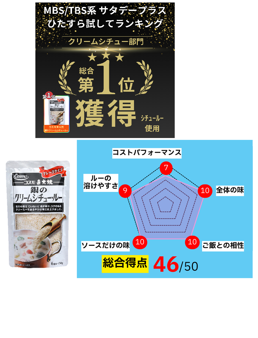 当社の【コスモ直火焼 銀のクリームシチュー・ルー】が、MBS/TBS系『サタデープラス』内「ひたすら試してランキング」の「クリームシチュー」部門において、全体の味・ソースだけの味・ご飯との相性・ルーの溶けやすさ・コストパフォーマンスという全項目で高い評価をいただき、総合第1位を獲得しました。