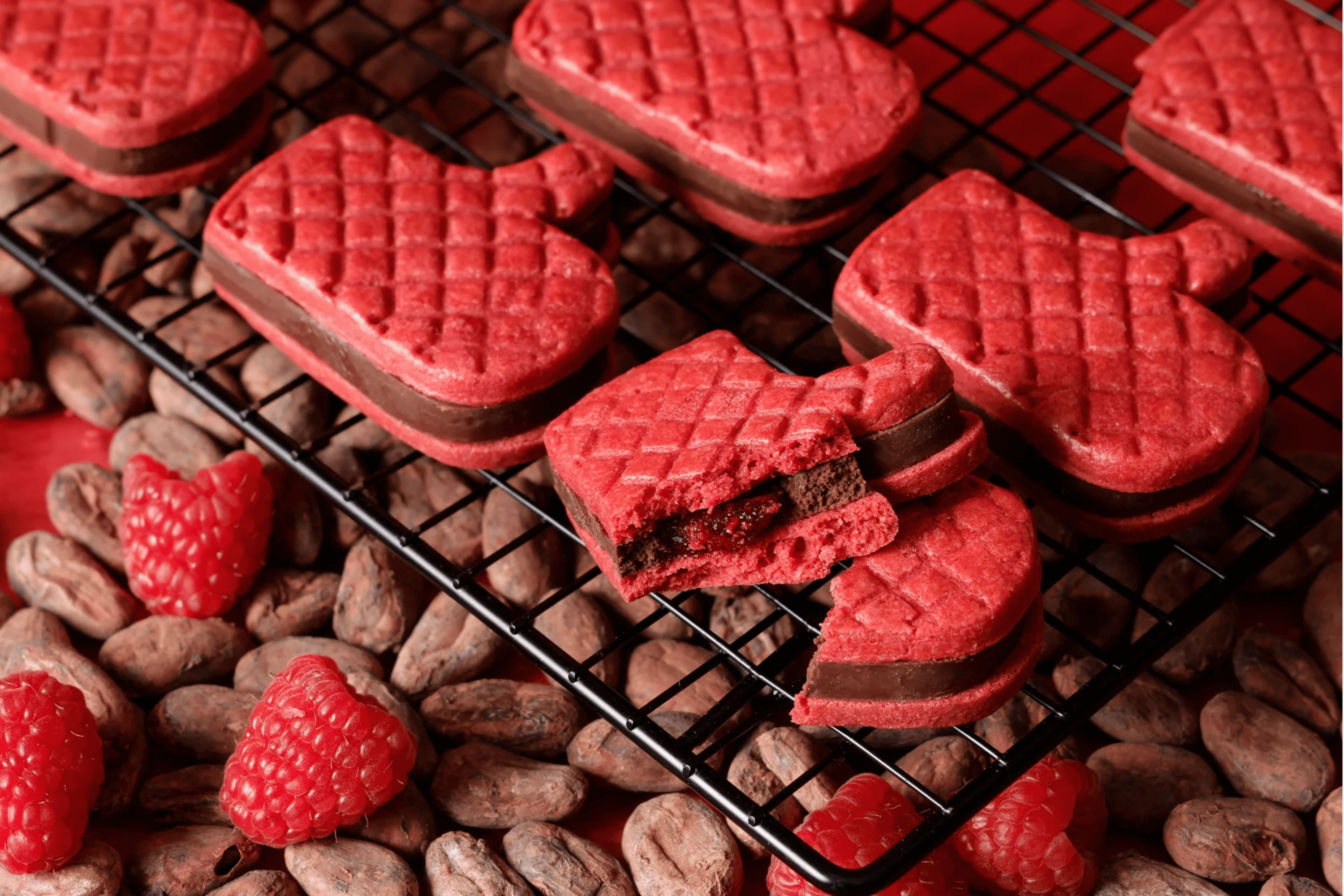 ラズベリー色の赤いミトンには、ビターチョコレートと甘酸っぱいラズベリーソースを閉じ込めました。サクッと軽やかなミトンクッキーに、くちどけの良い濃厚チョコレートとラズベリーのフレッシュな酸味が絶妙にマッチ。
