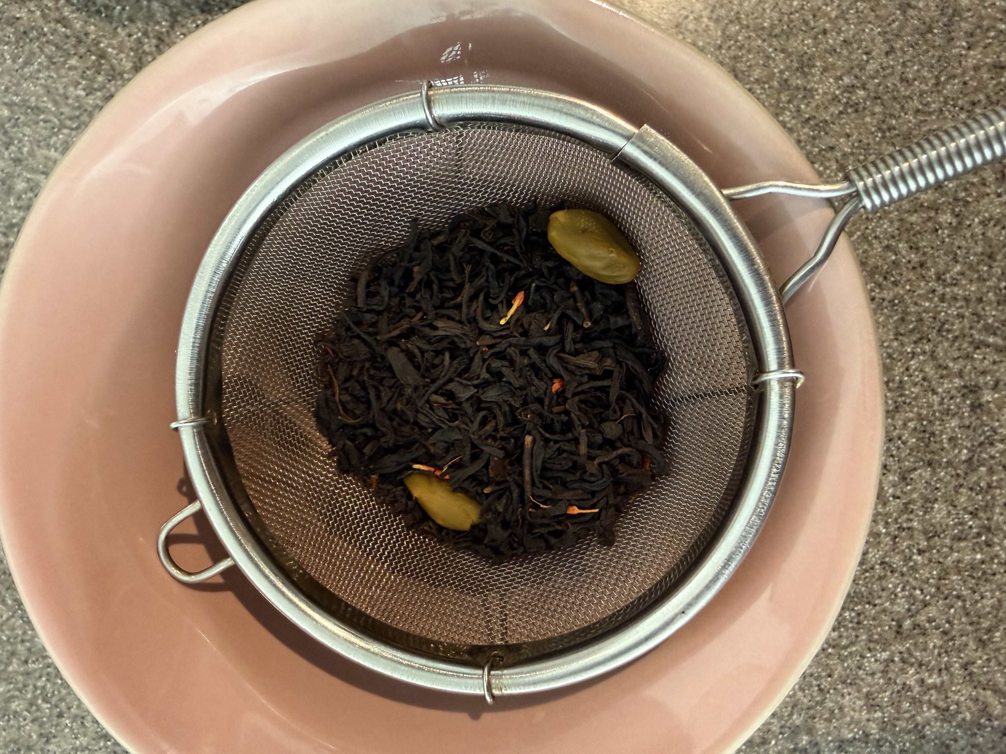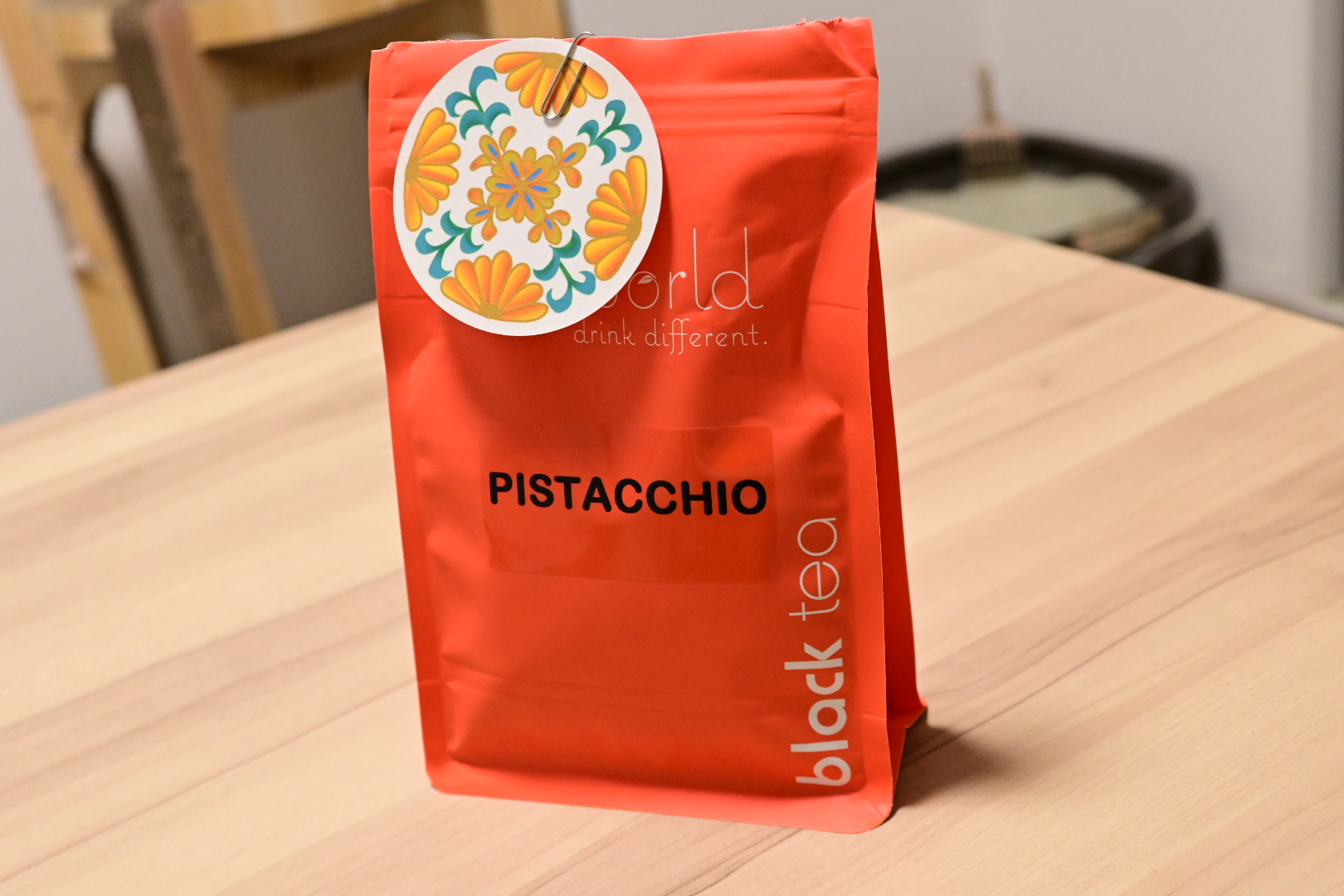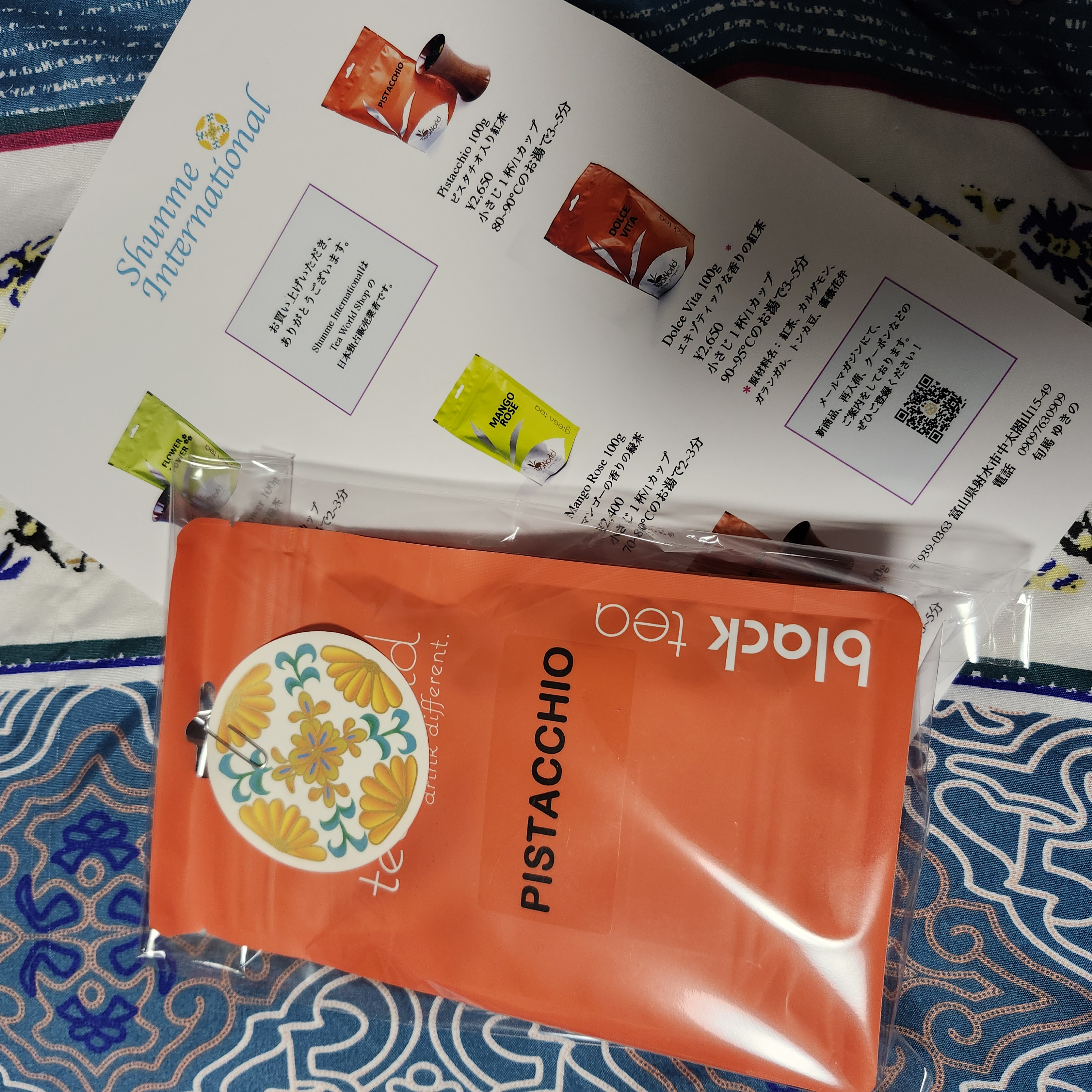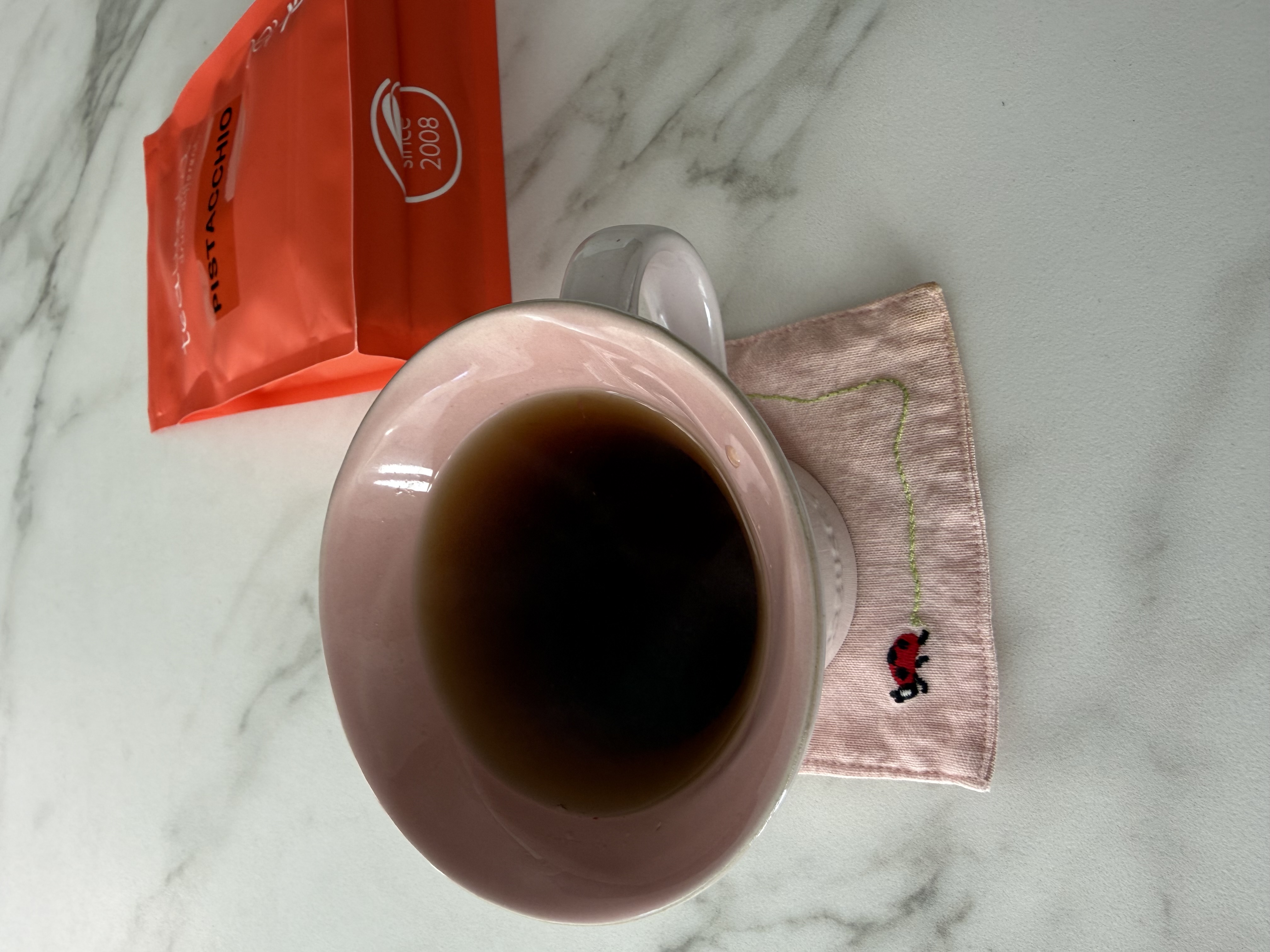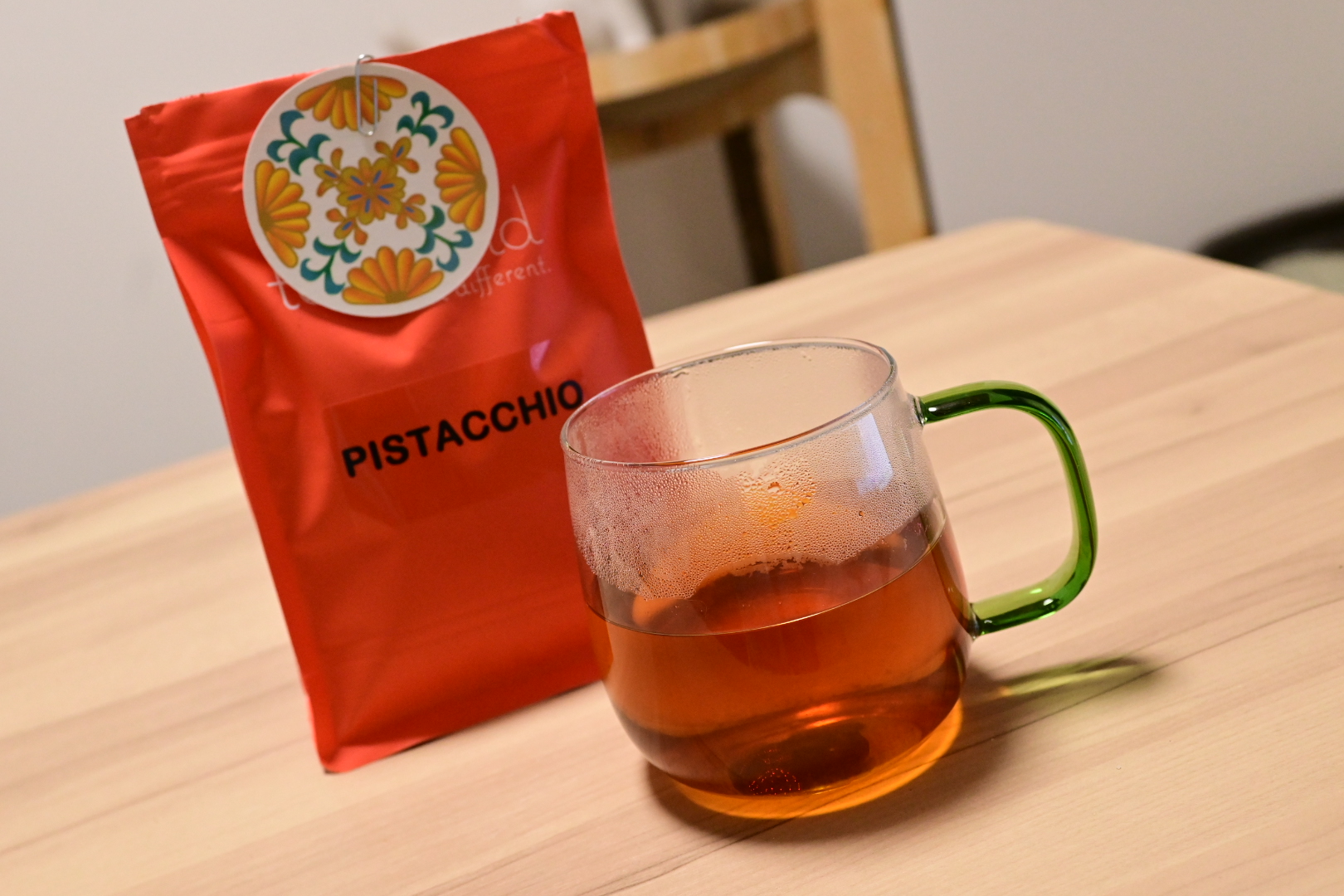 お湯を注ぐと、琥珀色の美しい色合いとともに、ほんのり甘さを感じる香りが立ち上がり、ティータイムの気分が一気に華やかに。飲み口はすっきりとしていながら、後味にピスタチオのコクがやさしく残り、甘いお菓子はもちろん、シンプルなビスケットとも相性が良さそうです。