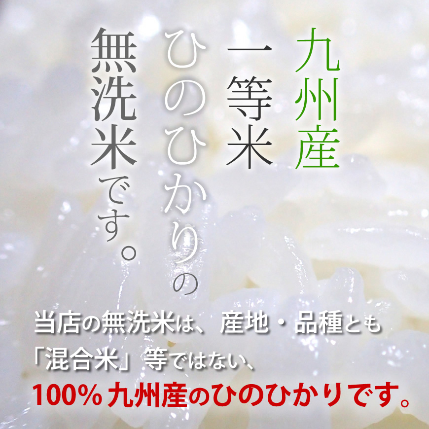 「混合米」ではない、100%九州産のヒノヒカリです。味わい、舌触り共に良好。安心製法で仕上げたキレイで美味しい無洗米です。