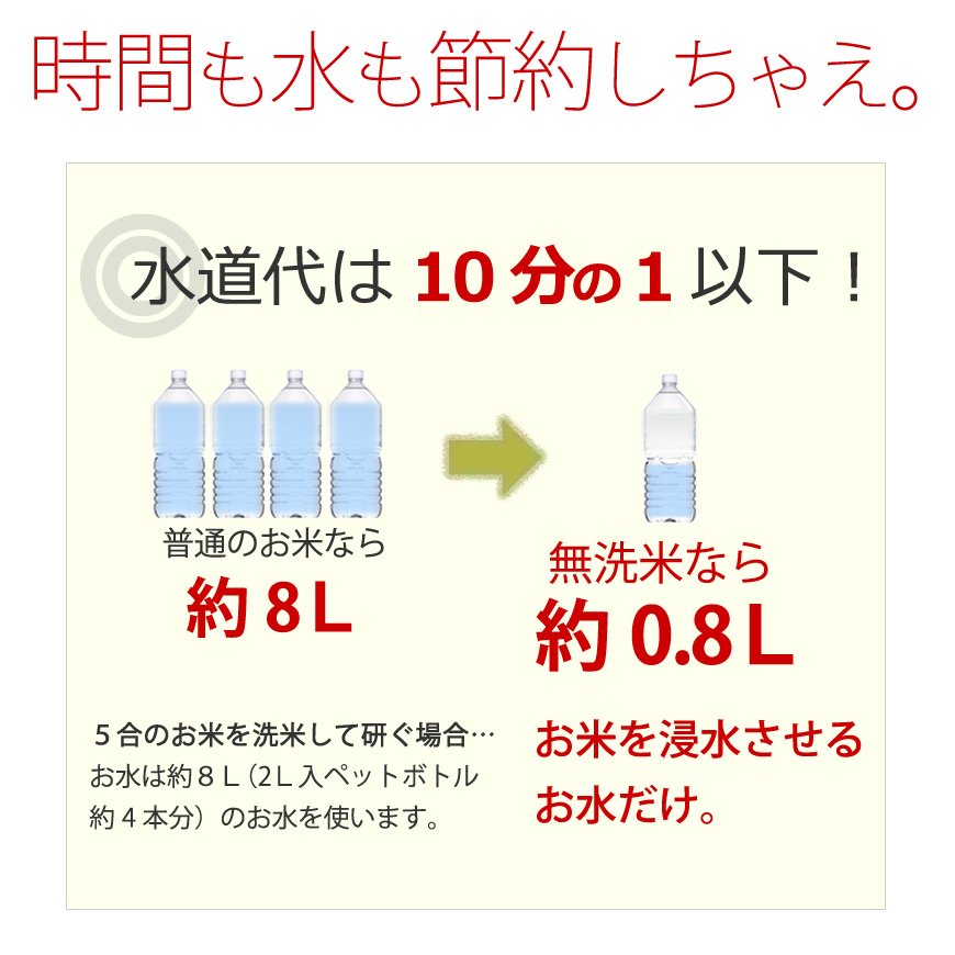 5合の有洗米を洗米して研ぐ場合、約8Lのお水が必要ですが、無洗米はお米を浸水させる約0.8Lのお水だけとなり、水道代は1/10以下です。また、洗米も研ぐ必要もありませんので手間もかかりません。肌ヌカ除去済みの無洗米は正味量が増します。