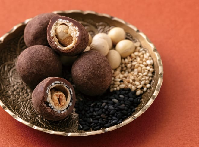 香ばしい胡麻と食感の良い大豆、さっくりとした⾷感の⽣地を、マダガスカル産カカオのミルクチョコレートで包みました。マダガスカル産カカオは、ベリーのような酸味とシトラスを思わせる爽やかな香りが特徴。その透明感のある風味を引き立てる素材を丁寧に重ねました。