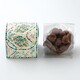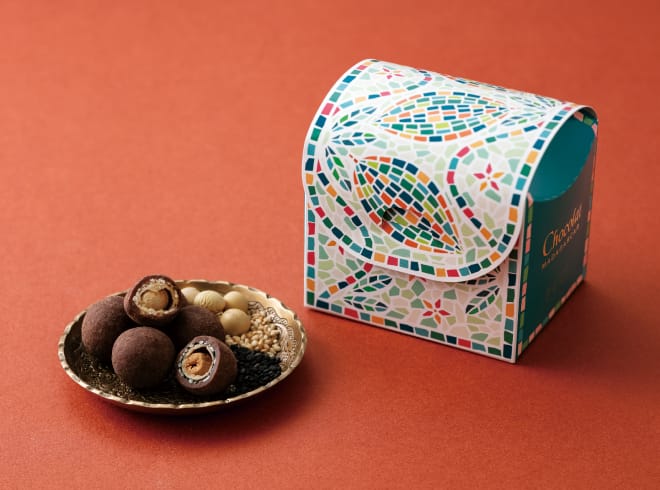 香ばしい胡麻と大豆に、マダガスカル産カカオの豊かな香りが重なる「ショコラ」です。さっくりとした生地と、胡麻をたっぷりと大豆に纏わせ、ミルクチョコレートで包んでいます。香ばしい胡麻と赤い果実を思わせる香りのマダガスカル産カカオが好相性です。大豆の食感がアクセントとなり、最後まで飽きのこない味わいが楽しめます。モザイク風のイラストが印象的なボックスに入って届くので、贈り物にもおすすめです。