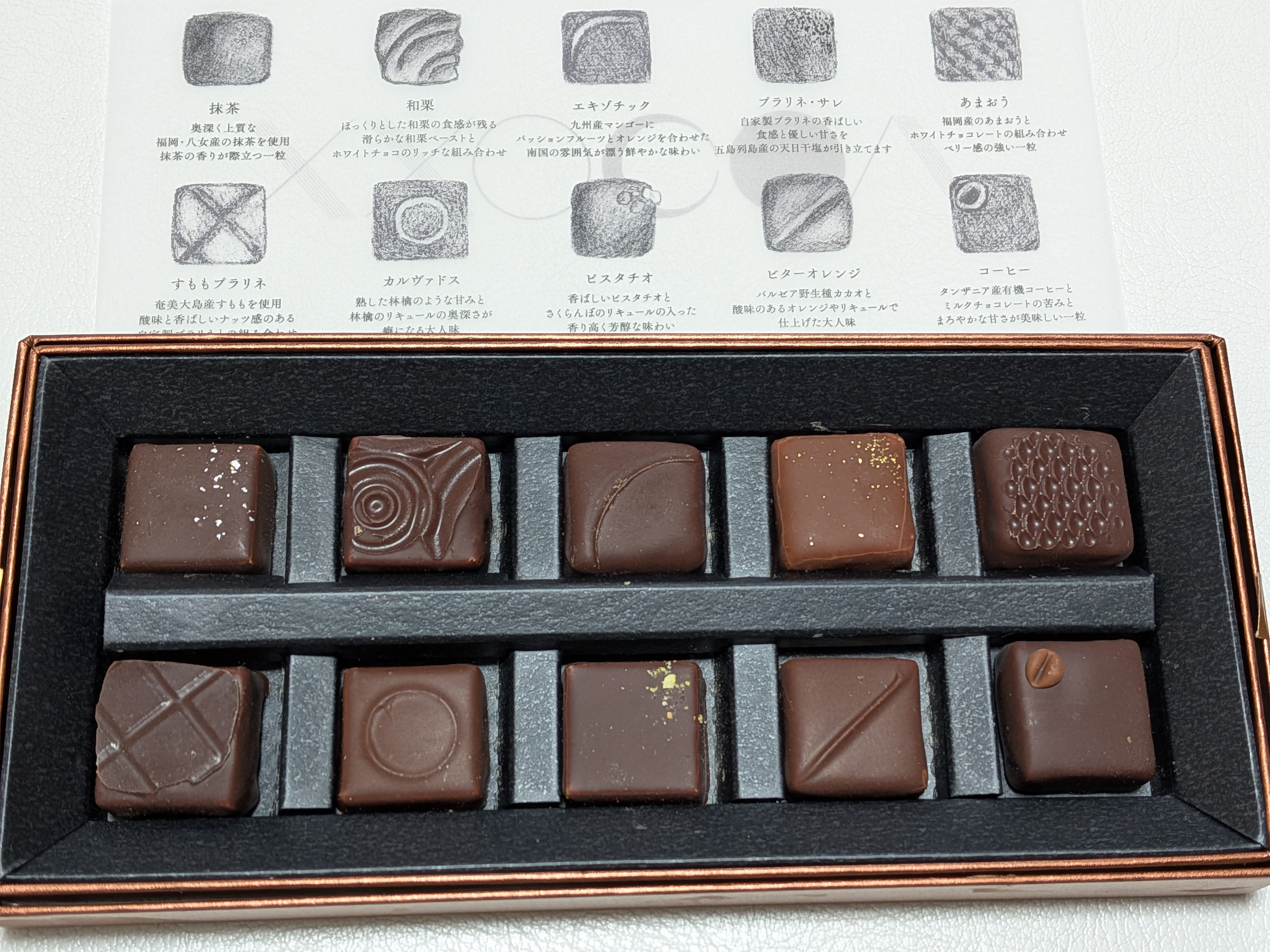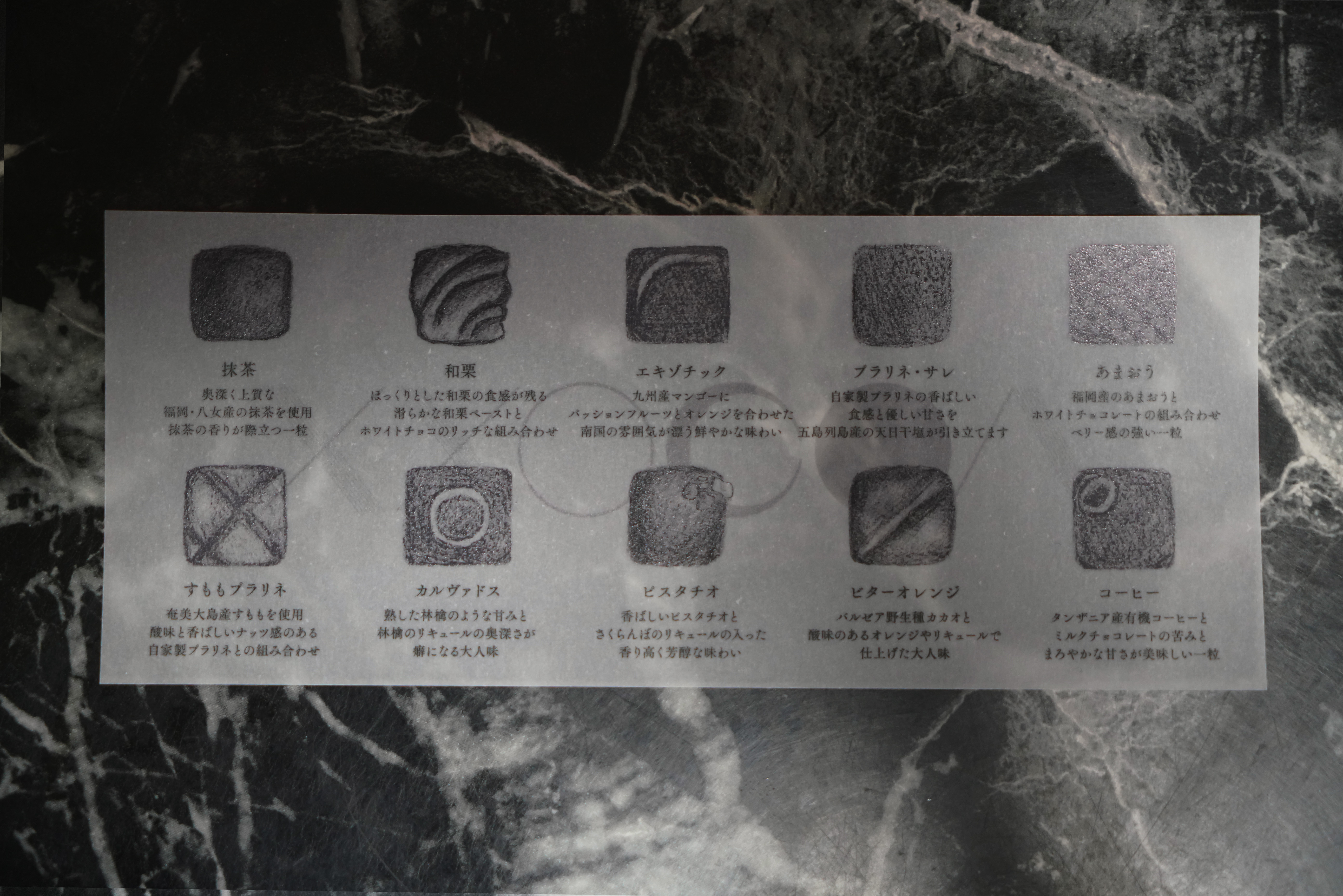 抹茶、和栗、エキゾチック、プラリネ・サレ、あまおう、すももプラリネ、カルヴァドス、ピスタチオ、ビターオレンジ、コーヒー。