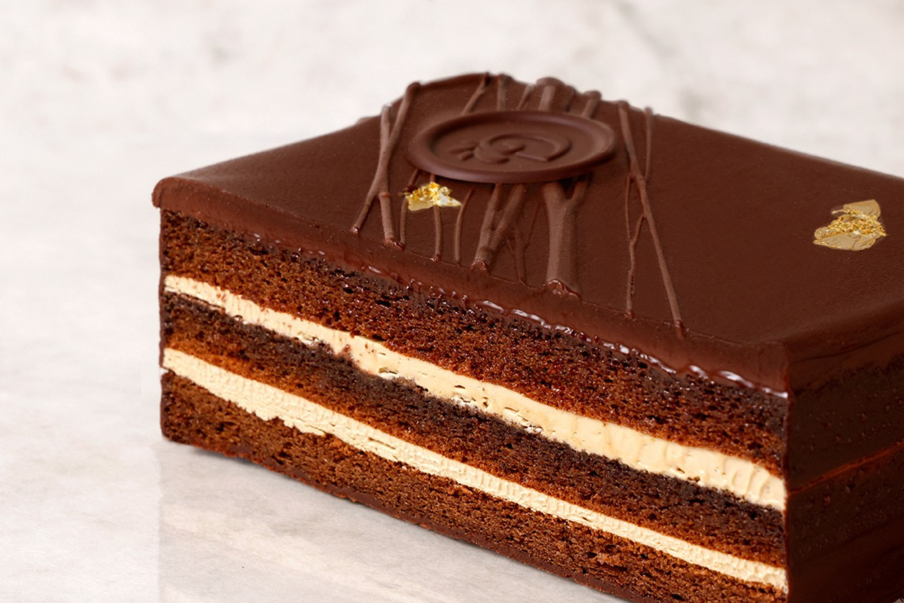 デリーモのオペラは、バタークリームを中心に組み立てています。バターはしっかり泡立てて軽くし、チョコレート生地と重ねて層を作っています。