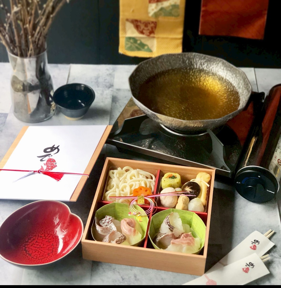 鯛はお出汁をさっと7秒ほどくぐらせて、ミディアムレアの状態でお召し上がりいただくのがおすすめ。