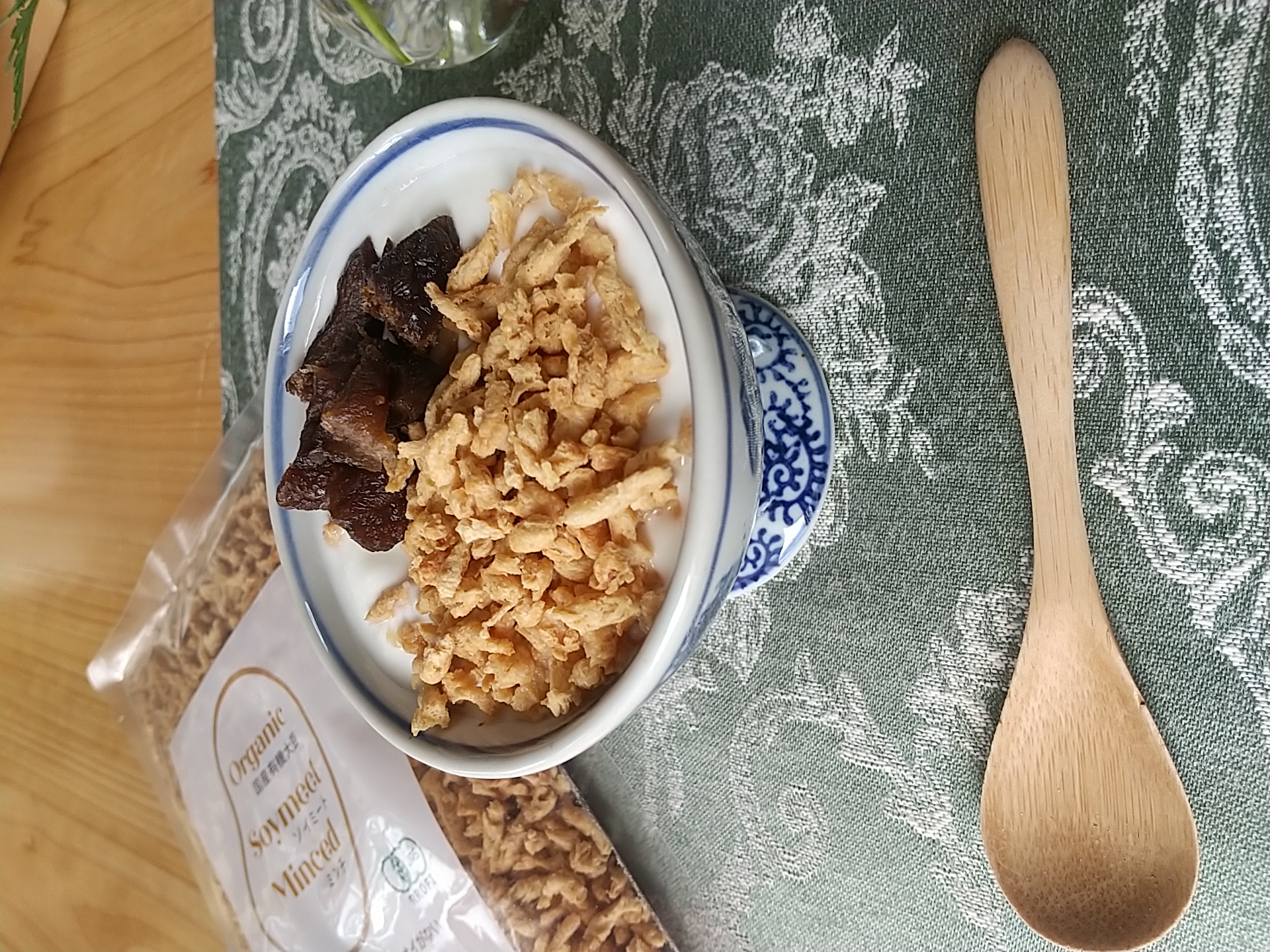 乾燥した状態の大豆ミンチは軽く、見た目もシリアルのような状態です。パッケージにはシリアルに混ぜて食べても良いとあったので、ヨーグルトにかけてみました。ミンチ=肉の扱いだと思っていたので合うのかどうかは半信半疑でしたが大豆ミンチ自体に味がついていないこともあって、フルーツの缶詰を加えたヨーグルトにはよく合いました。大豆本来の香ばしさのある香りやサクサクした食感がアクセントとなりますし、大豆のタンパク質もプラスできるので栄養的にも良い組み合わせだと思います。