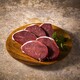 モモ肉はエゾ鹿肉の中でも最も脂肪が少なく、きめ細やかな赤身が特徴です。当店の熟練の目利きと、素早く丁寧な職人技により、特有の臭みを抑え、しっとりと柔らかな食感に仕上げました。噛むほどに溢れ出す、野生味あふれる濃密な赤身の旨味をご堪能いただけます。
