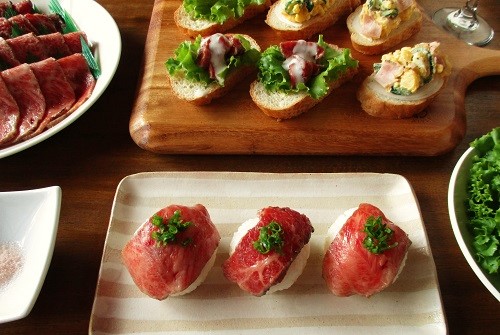 当店では生姜醤油をオススメしています。わさび醤油では和の風味が広がり、お塩で食べるとお肉の甘みを感じます。ローストビーフ丼や手鞠寿司、カルパッチョなど色々と楽しめます。