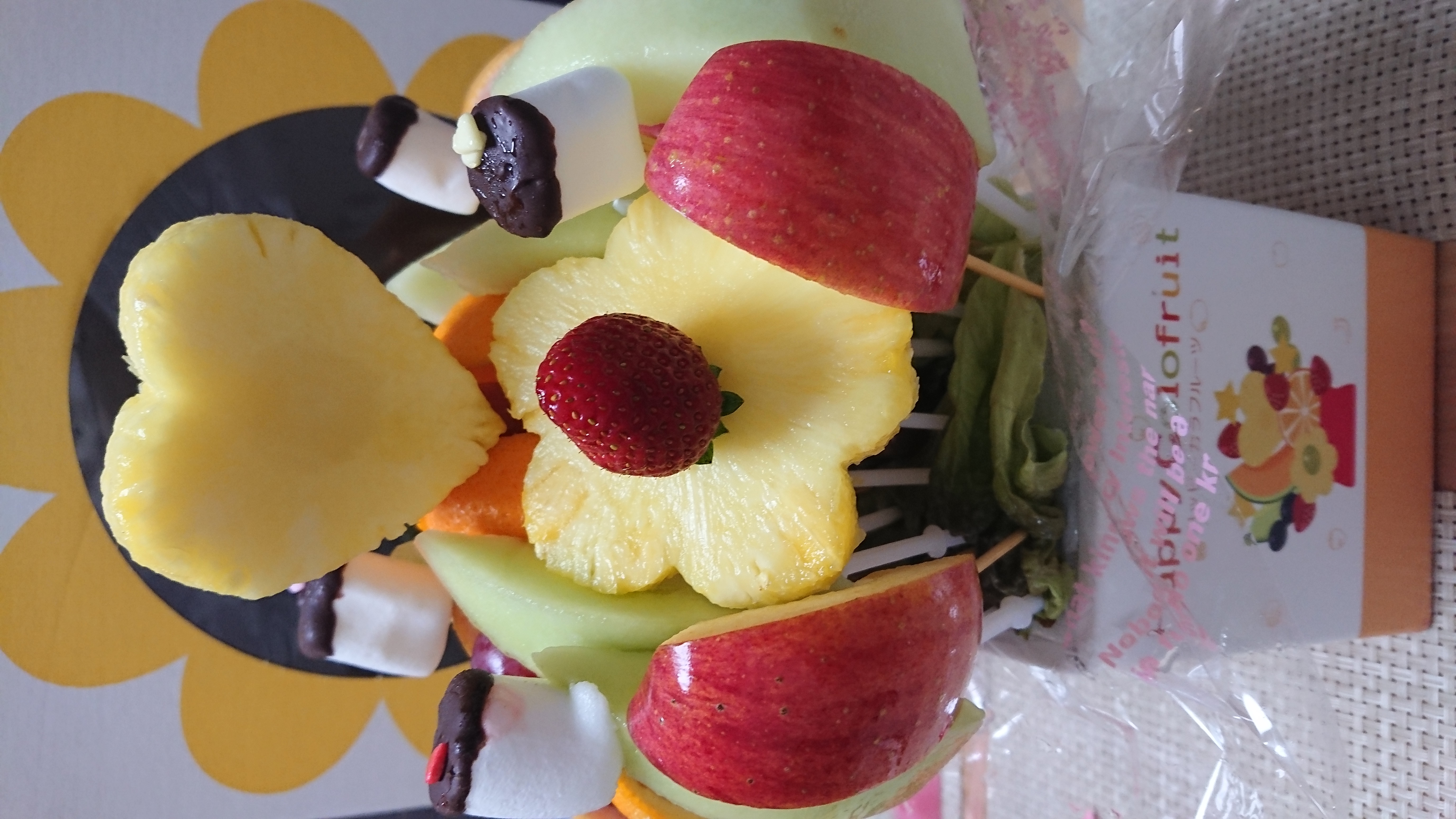 パイナップル、オレンジ、イチゴ。色んな果物がこれでもかと詰め込まれ、ブーケの形を成している。とても可愛い見た目でした!一つ一つが串に刺さっているので、子どもたちも