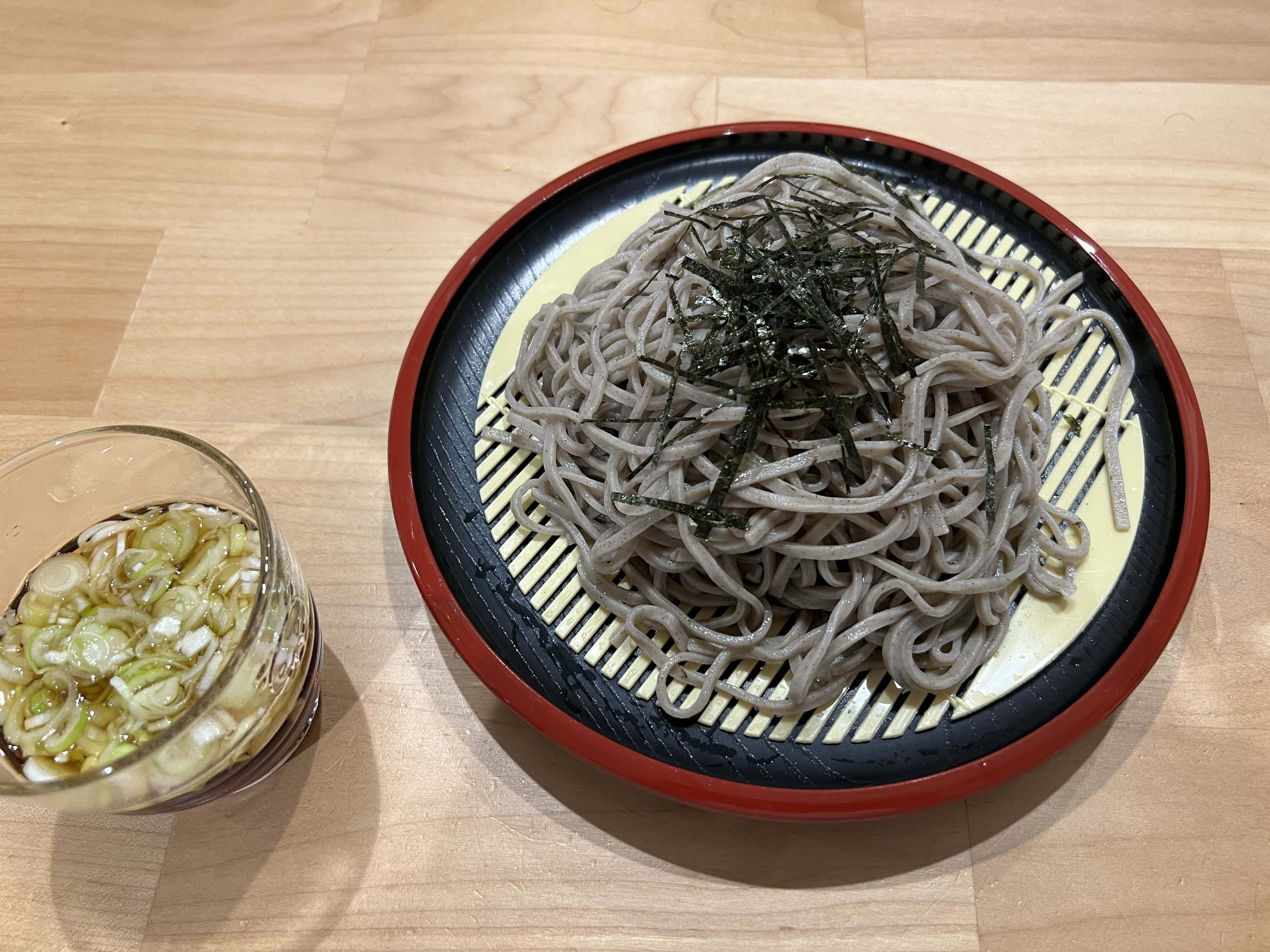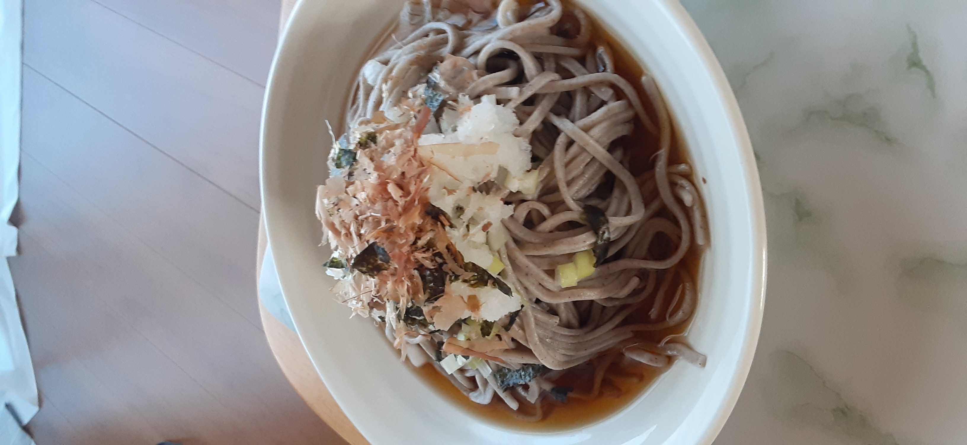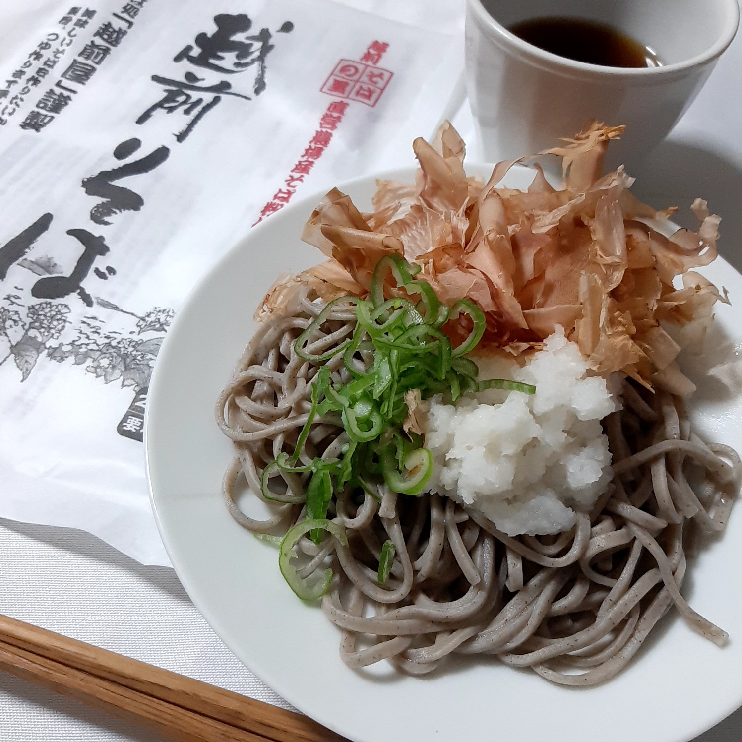大根、なめこ、ねぎ、かつお節を用意し、さっそく冷たいおろしそばでいただきました。