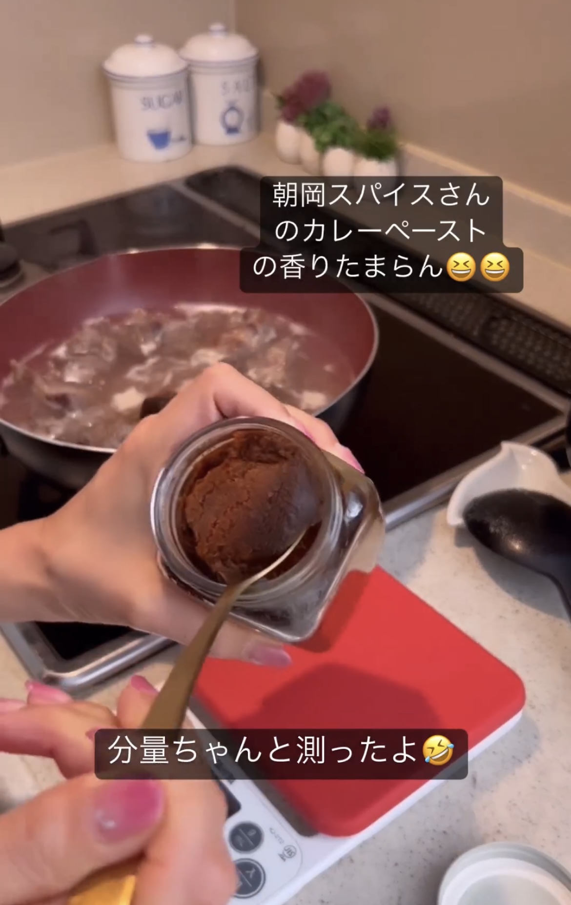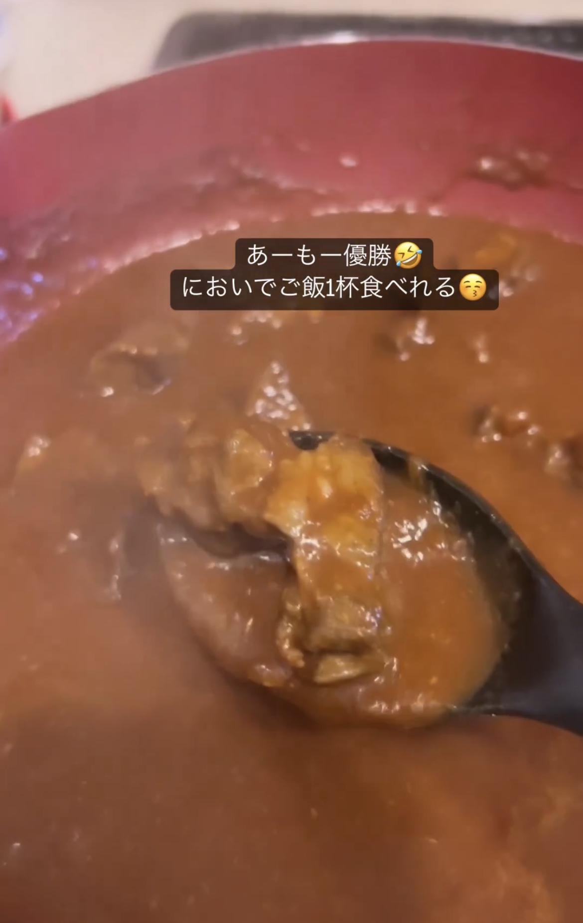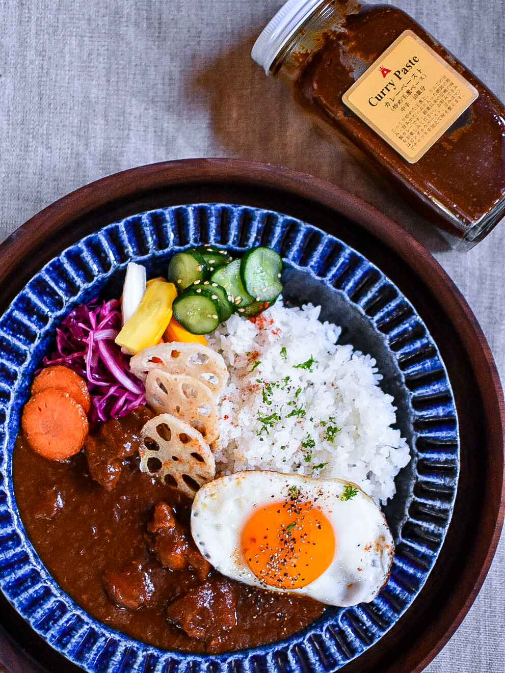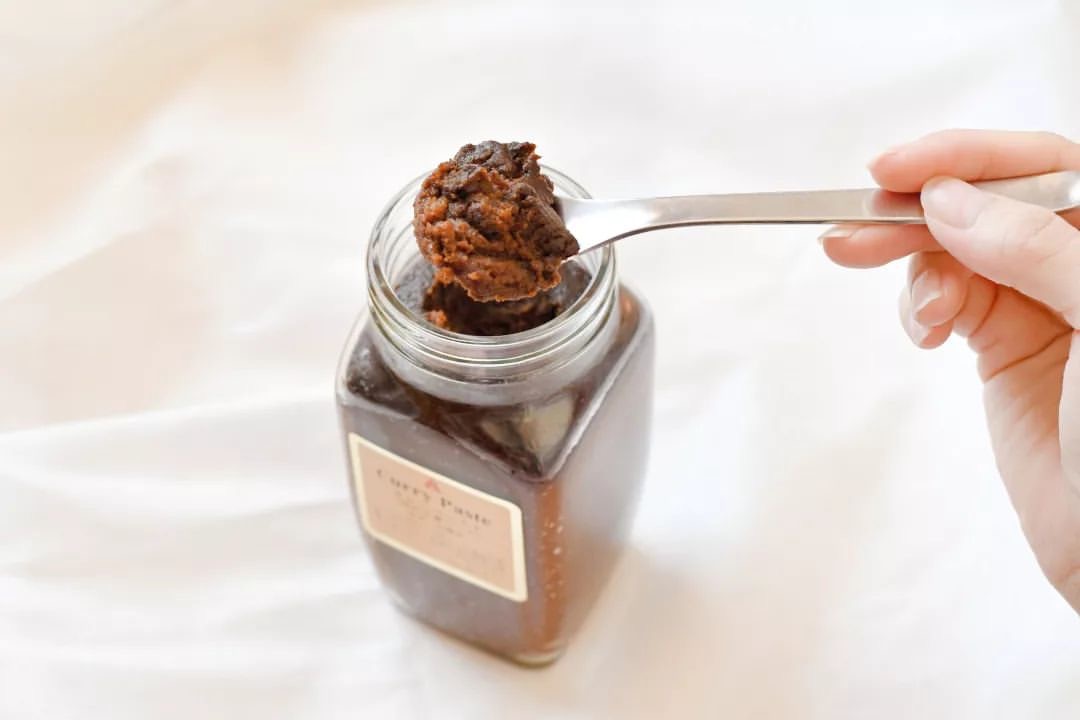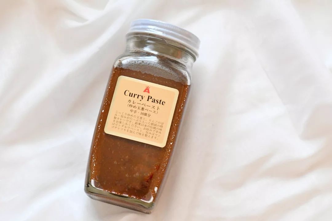 カレーペーストの瓶を開けると、すでにおいしそうな香り✨玉ねぎやりんごなどとスパイスがじっくり炒めてあって、すでに味もついています。肉や野菜を炒めて、水とこのペーストを加えて煮込めば本格的なカレーが出来上がるという優れもの💕