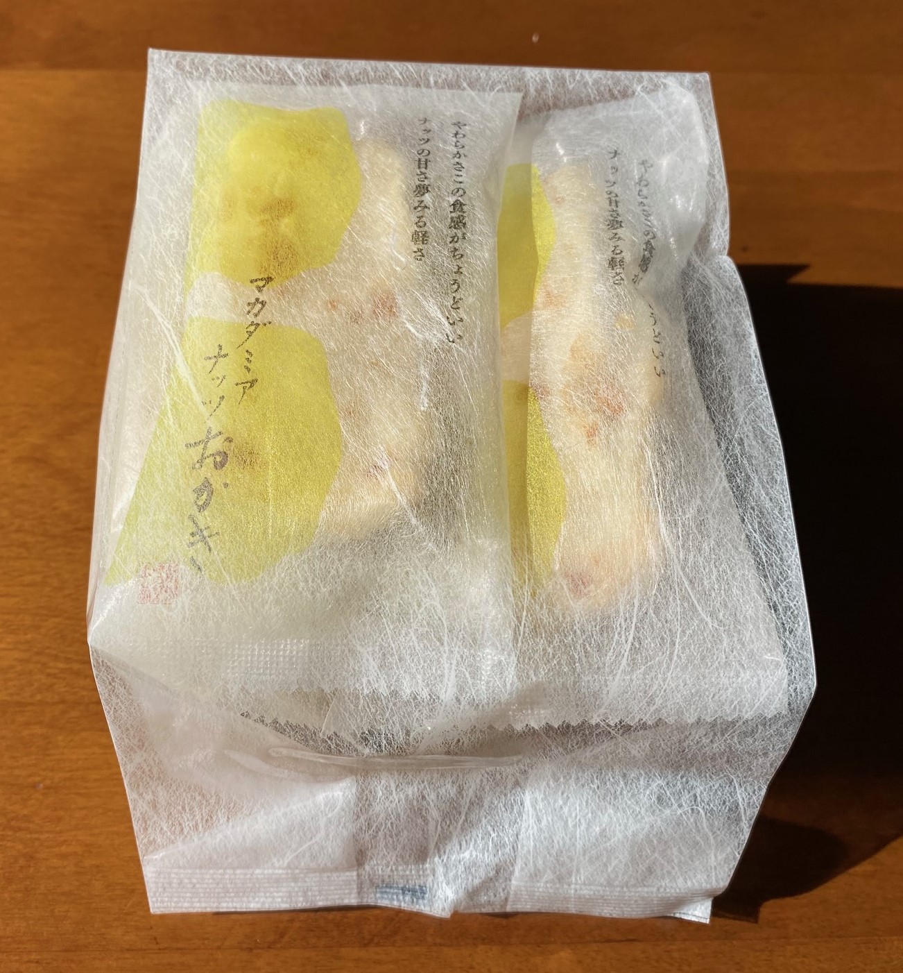 早速袋を開けてみて驚いたのはその大きさです。私の手(16cmくらい)と同じくらいの大きさ、つまり通常のおかきよりもかなりビッグサイズです。この大きさのお菓子にはテンションが上がってしまいます。一口齧ってみると硬さはほとんど感じず、しかし食感はよくサクッと割れました。まさに「軽い食感」という言葉が似合います。噛んだ瞬間からもち米の甘くて香ばしい香りが口の中に広がり、ナッツの香りと食感がアクセントとしてお米の香りを引き立てます。何よりもクセになるのはおかきの塩味です。辛すぎず薄すぎず、もち米とナッツのあまみ・旨みに寄り添うように全体を引き締めてくれます。おやつにもおつまみにもぴったりで、私は今回冷たい緑茶と一緒に味わいましたがほうじ茶、マカダミアナッツとおかきという新しい組み合わせなので紅茶、さらにはおつまみとして日本酒や白ワインなどと合わせるのも良いと思いました。また、このおかきは材料もシンプルでもち米も国産のものなので安心感も特別感も味わえます。