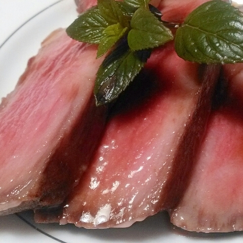 端を切り落とすと、きれいなサシのはいった、ピンクと白のコントラスの断面が・・・・美味しそう。