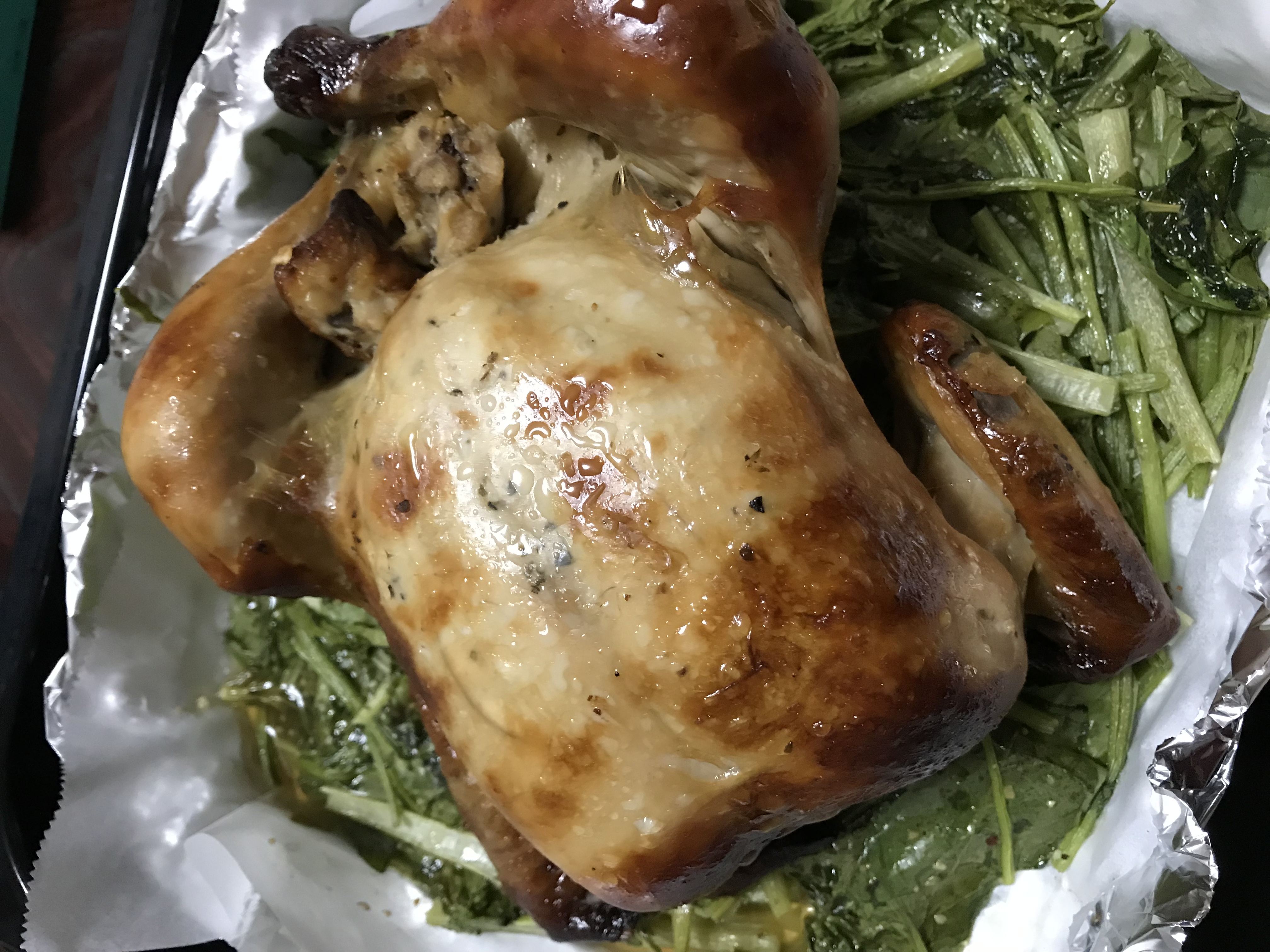 温め方が書いてある紙が入っていたので、湯煎してチキンを温めました。温まってくると、チキンの皮があめ色に変色してきて、とっても美味しそうです!
