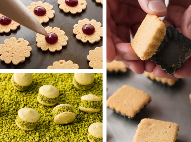 口へ運ぶと同時にホロホロとほどけるクッキーや、しっとりとした生地に酸味のある自家製ジャムをのせたクッキー、色鮮やかなピスタチオのサンドなど、それぞれに異なる風味や食感をもたせました。特製の型で抜いたり、手でひとつずつ形作ったり、生地を絞ったりと、その表情もさまざま。食感や形状など細部に至るまでこだわりを尽くしています。