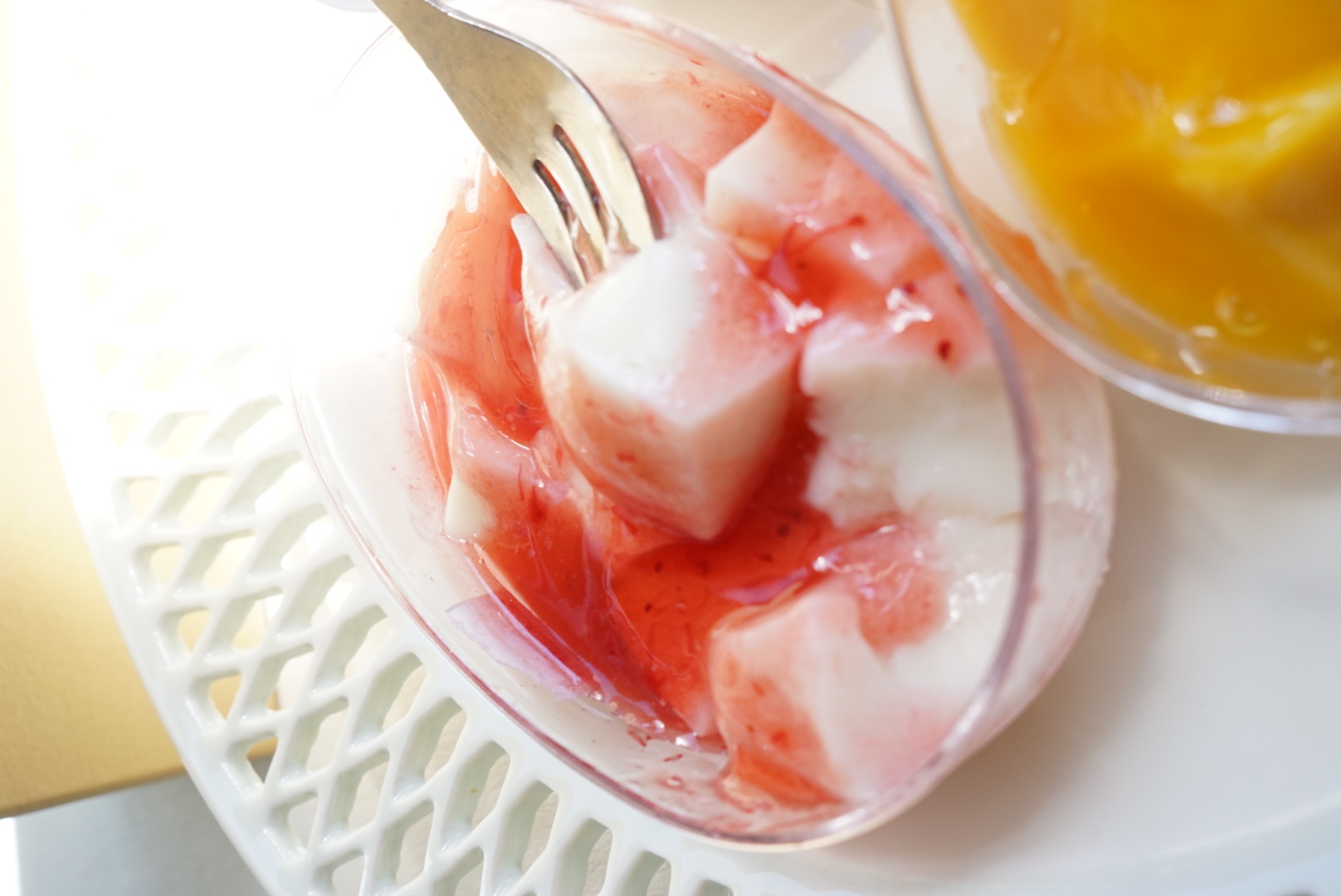 わらび餅といちごソースが合わさることで生まれる今まで経験したことのないようなまるで杏仁豆腐を食べているかのようなそんななんとも不思議な感覚のする商品でした。
