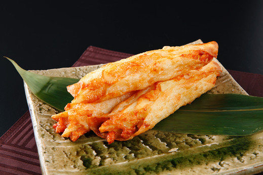 短冊状に切ったメークインと、すり身とバターを混ぜたものを、サモサシートで巻き蒸し上げてあります。お酒のおつまみにぴったりです。