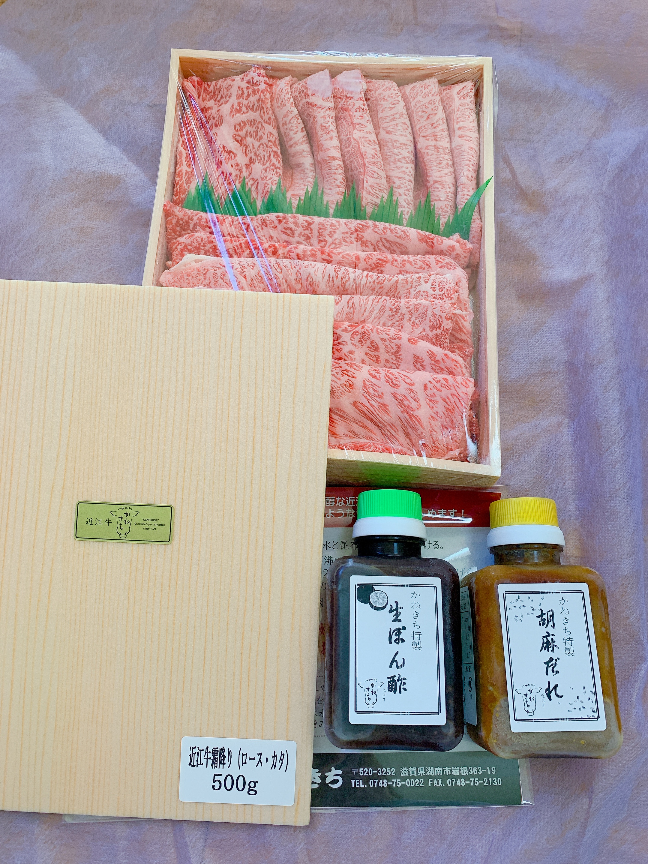 甘みのある上質の脂と、柔らかい中にも弾力のある旨みが凝縮された「近江牛」を堪能できるギフトセットです。「すき焼き用」か「しゃぶしゃぶ用」好みの商品が選べます。熟練の職人が厳選し、匠の技術で解体、加工した最高級近江牛なので、霜降りの度合いが高く、美しいサシが入っています。しつこさやくどさはなく、口に入れた瞬間から、するするとした口どけ、柔らかい肉質を楽しめます。しゃぶしゃぶ用には「ぽん酢」「胡麻しゃぶのたれ」、すき焼き用には「丁子麩」「割りした」付き。化粧箱入りなので上質な贈り物にもおすすめです。