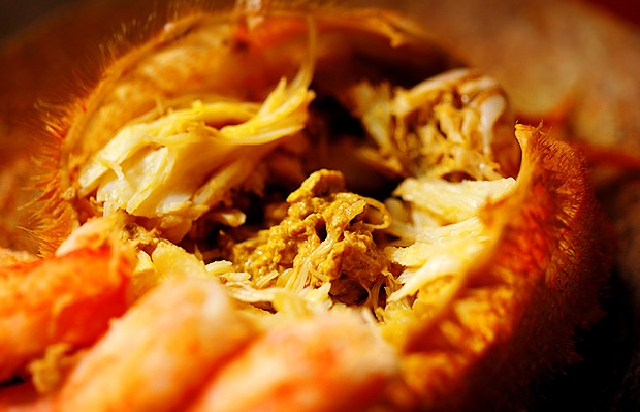 先に、上に載っている脚肉全部と、甲羅に詰まっているほぐし身の半分程を別皿に移して、そのままお召し上がりください。