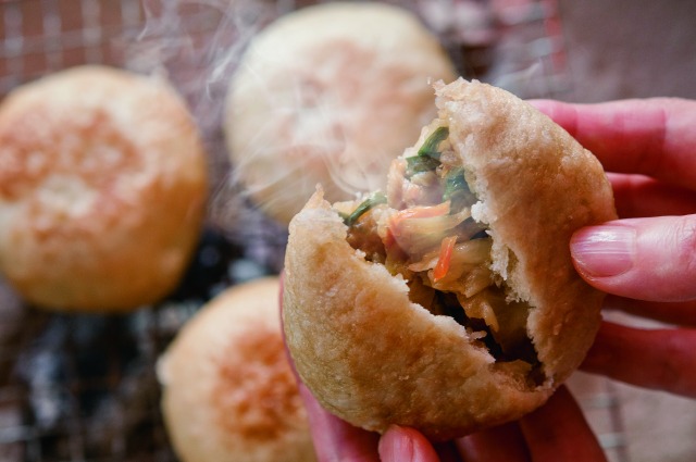 信州の郷土食「おやき」、信寿食はごちそう具材をもっちり皮で包み込んでいます。