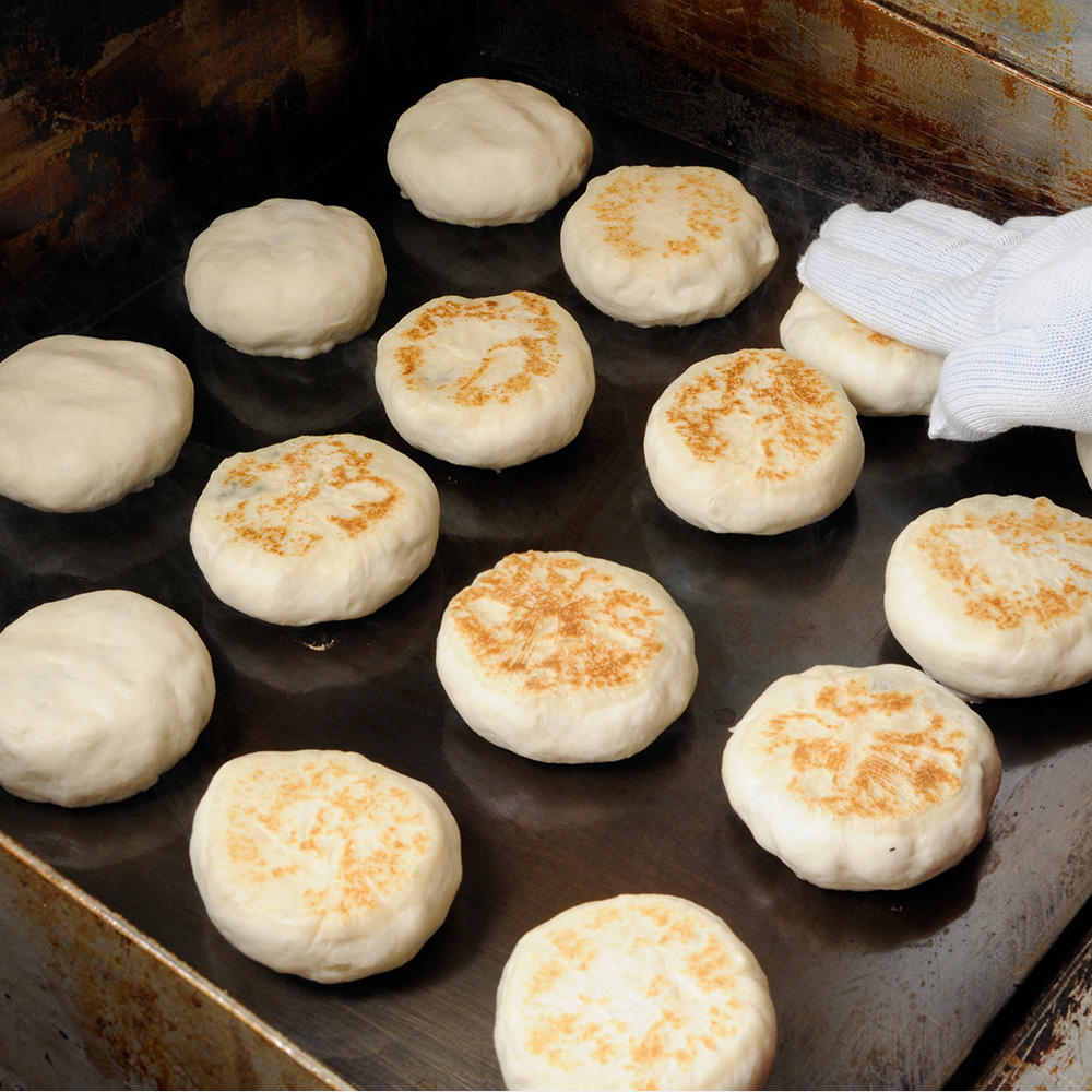 こんがり焼き色をつけた後に油で揚げ、蒸しています。もちもちとした食感とカリっとした食感をお楽しみいただけ人気です。